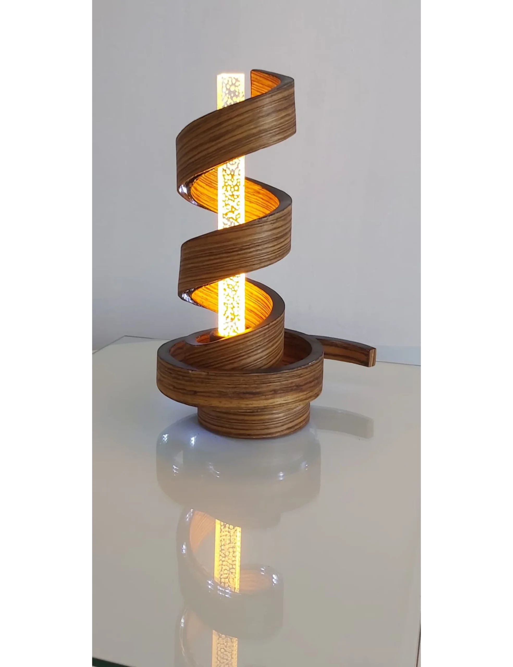 The lamp’s form features a carefully twisted and compressed open-top design, creating an organic flow that emits a soft, atmospheric glow. The body is wrapped in genuine olive wood veneer, showcasing its unique grain patterns and natural charm.