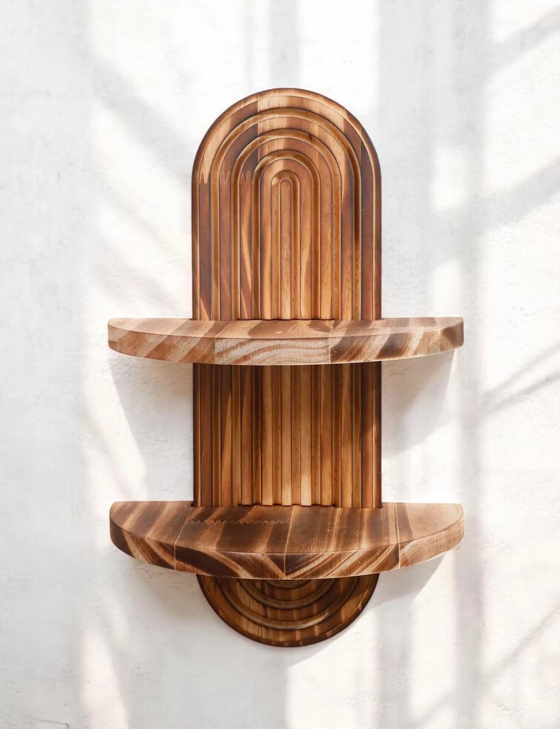 Transform your walls with this handcrafted boho-style wall shelf, designed to balance charm and function. Featuring a distinctive arched shape and a beautifully aged, charred wood finish, this shelf blends rustic elegance with mid-century modern flair. The visible grain and organic textures make each piece one-of-a-kind.