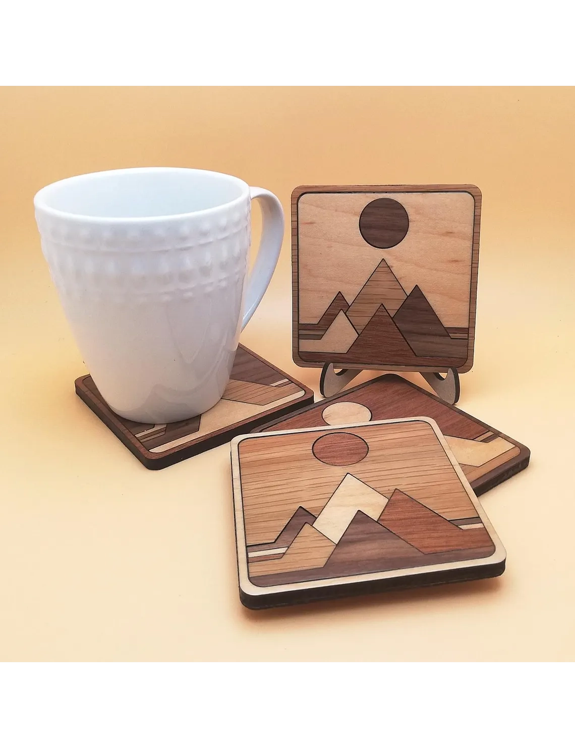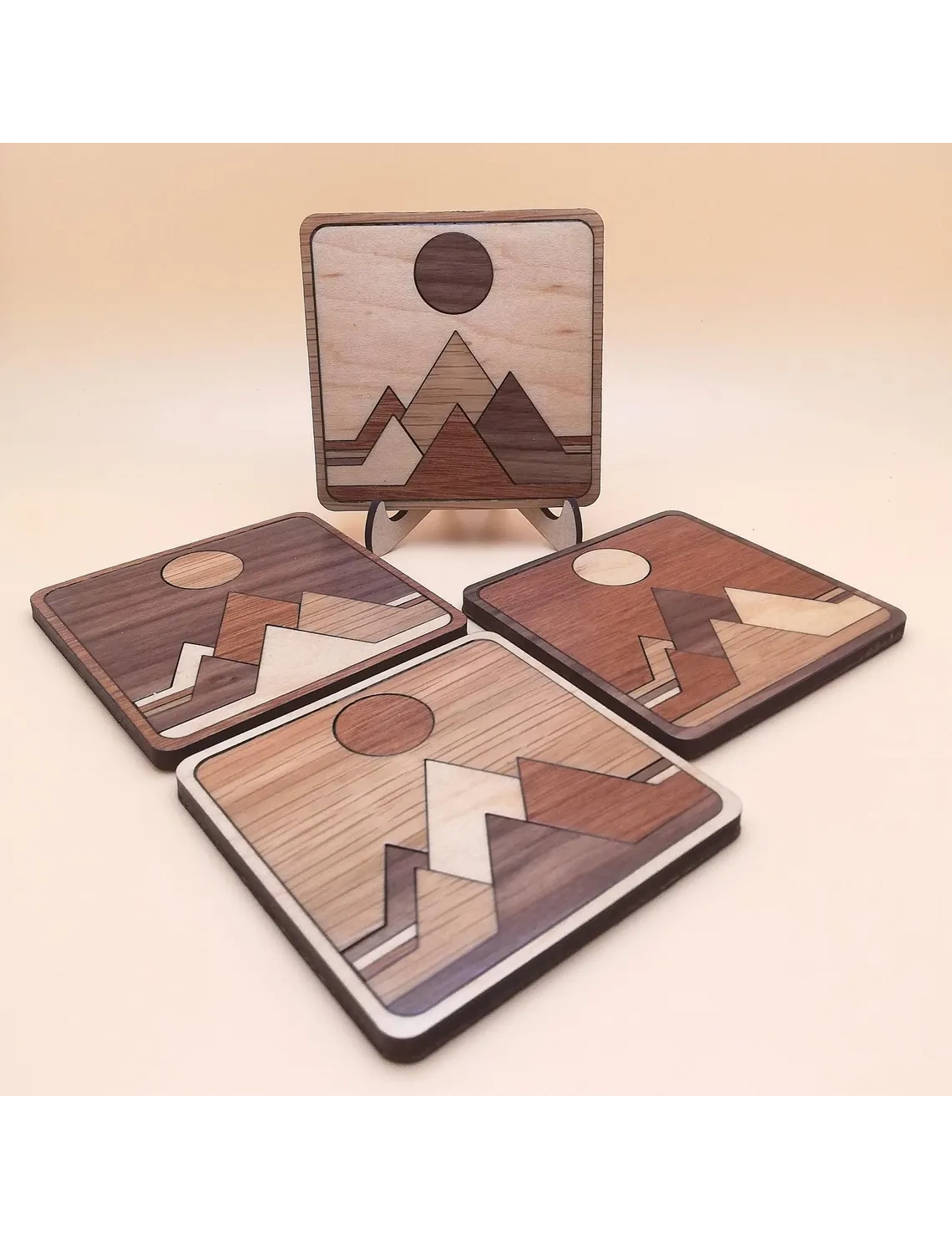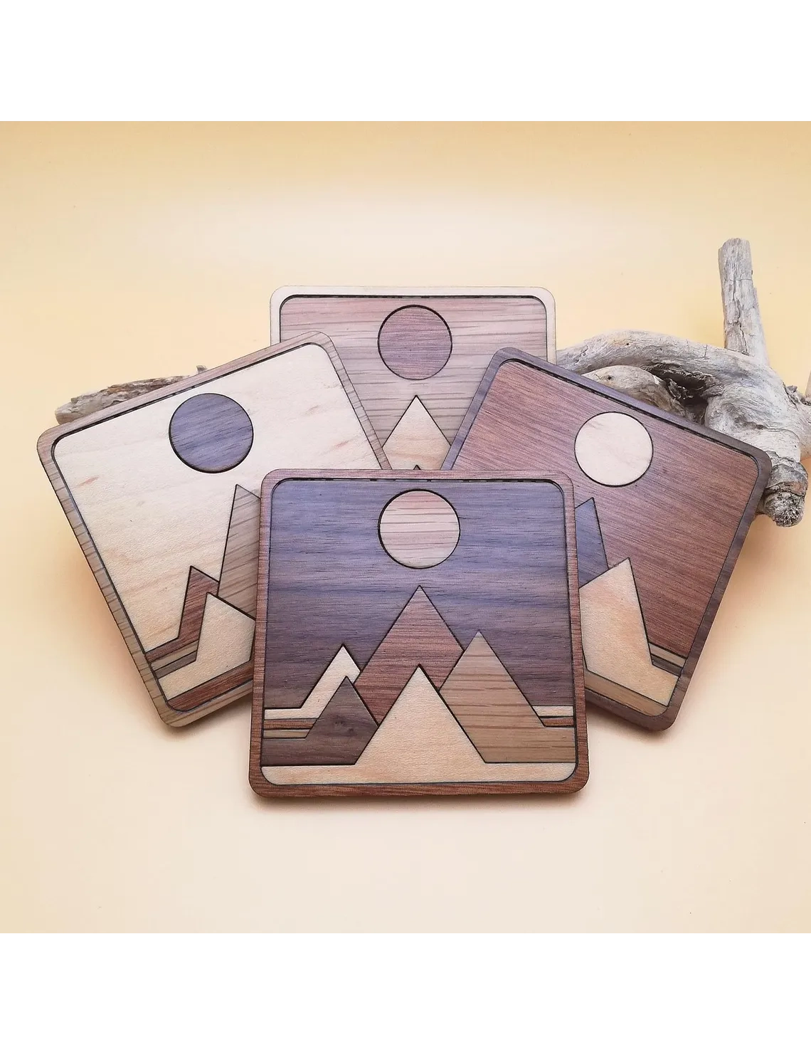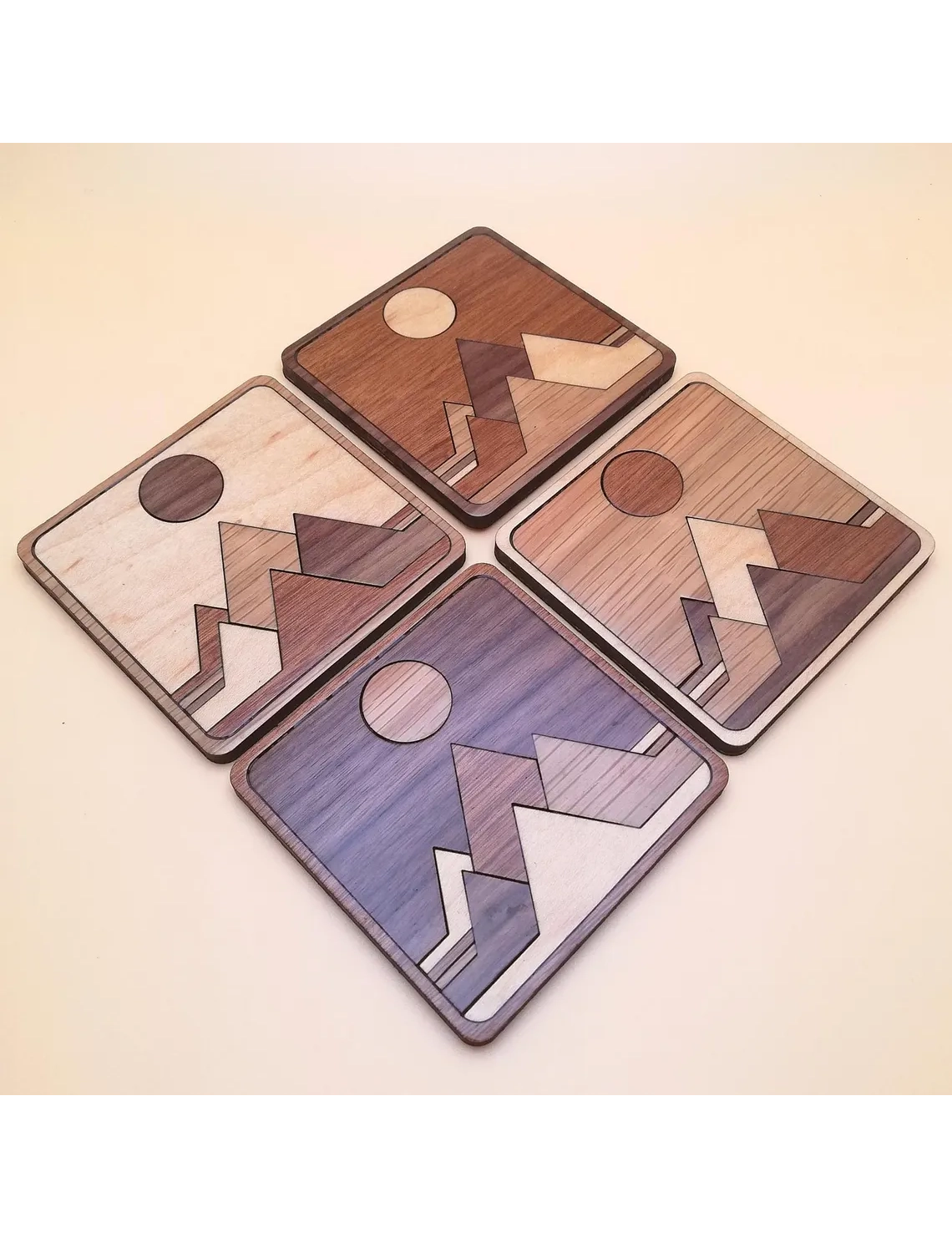 Each coaster in this set of 4 is meticulously laser cut using premium maple, cherry, mahogany, and walnut natural plywood. The cherry blossom design is achieved through traditional wood inlay techniques, highlighting the delicate contrast between light and dark grains. A satin varnish protects the wood while maintaining its natural texture and warmth.