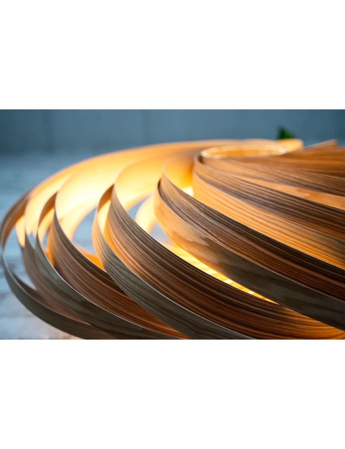 Inspired by the Fibonacci spiral, the features wide olive ash slats framed by narrow wooden strips—resulting in a breathtaking interplay of light and shadow. The wood grain glows warmly when illuminated, and thanks to the glare-free design, it’s as functional as it is artistic.