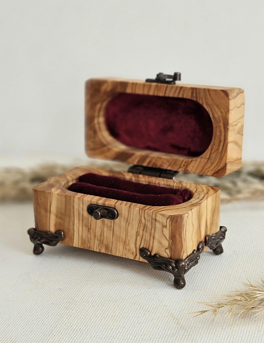 Handcrafted from Premium Quality Natural Wood and finished with natural oils our this vintage-inspired double ring box features antique copper legs and a velvet interior. This piece is designed for proposals, weddings, and luxury gifting offering perfect craftsmanship and a unique grain pattern that makes every piece truly one of a kind.