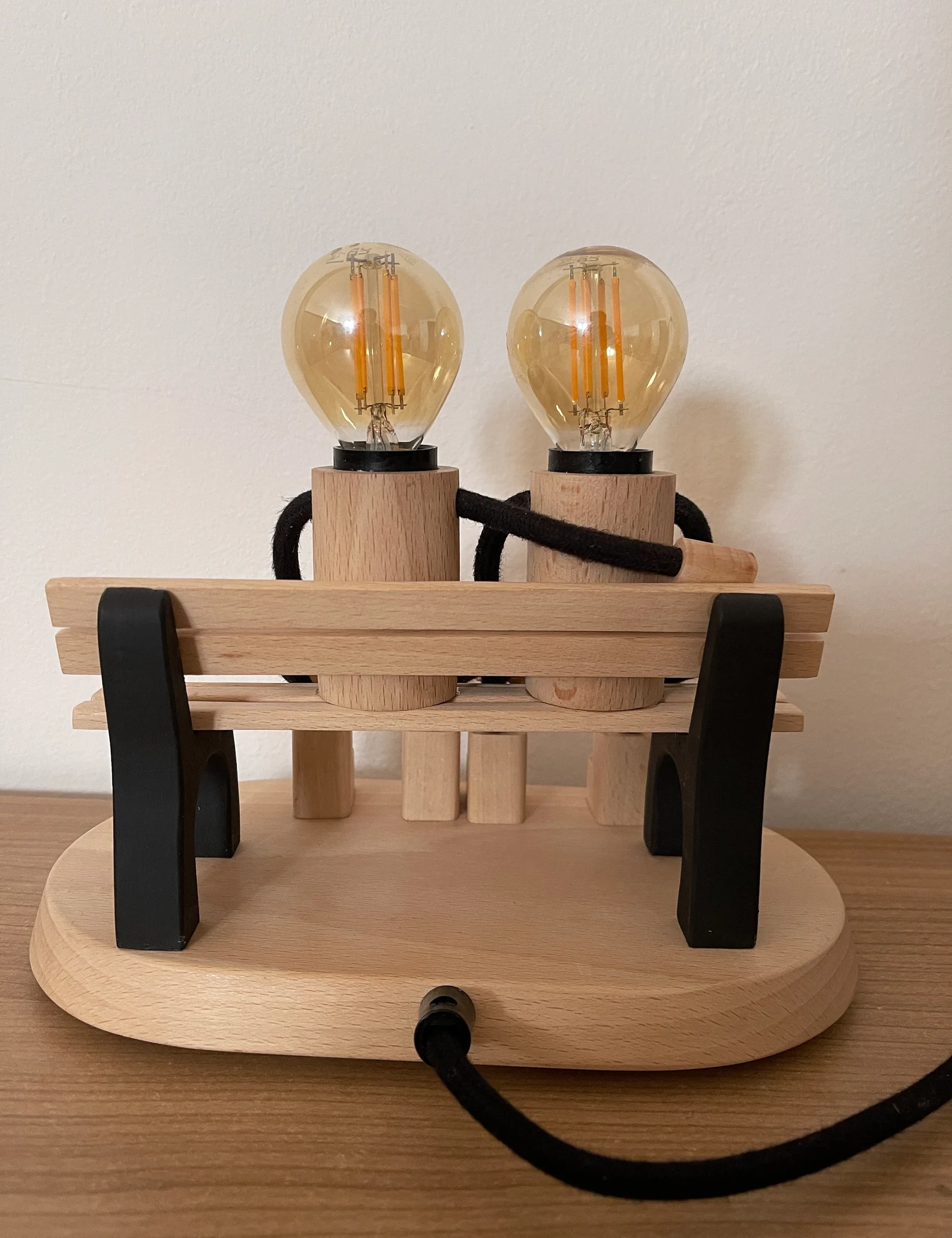 The textile cord adds a rustic vintage charm, while the slightly adjustable wooden arms let you pose the characters in different positions—adding personality and depth. Perfect for ambient lighting, it pairs beautifully with a soft retro-style Edison bulb for a cozy glow or a brighter bulb for functional light.