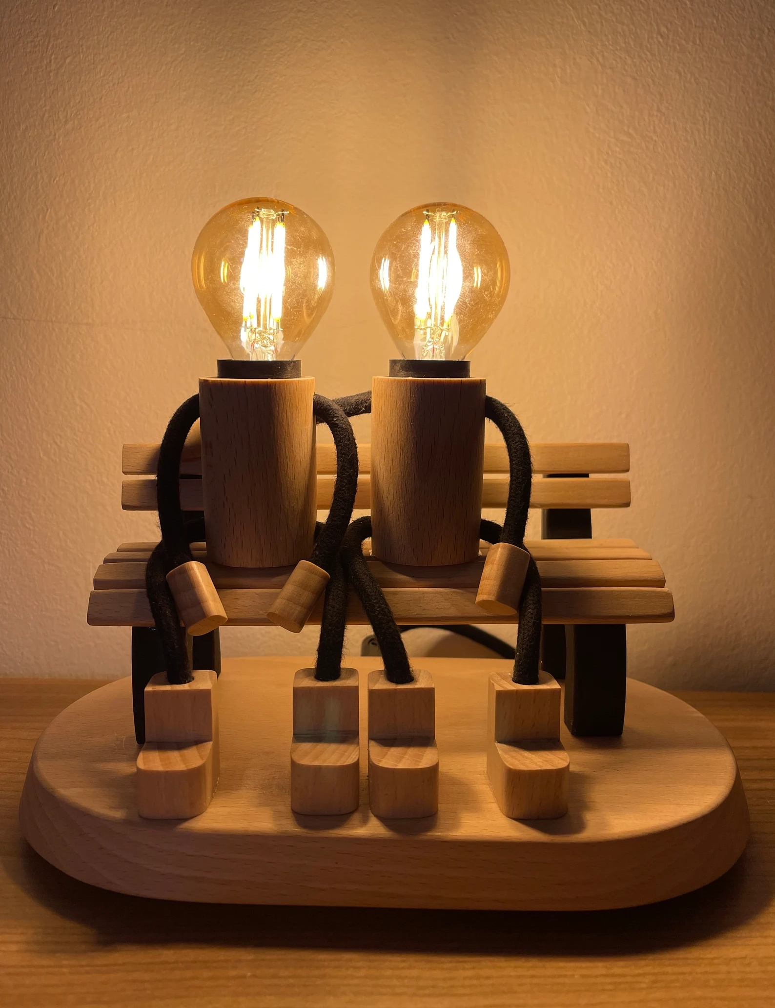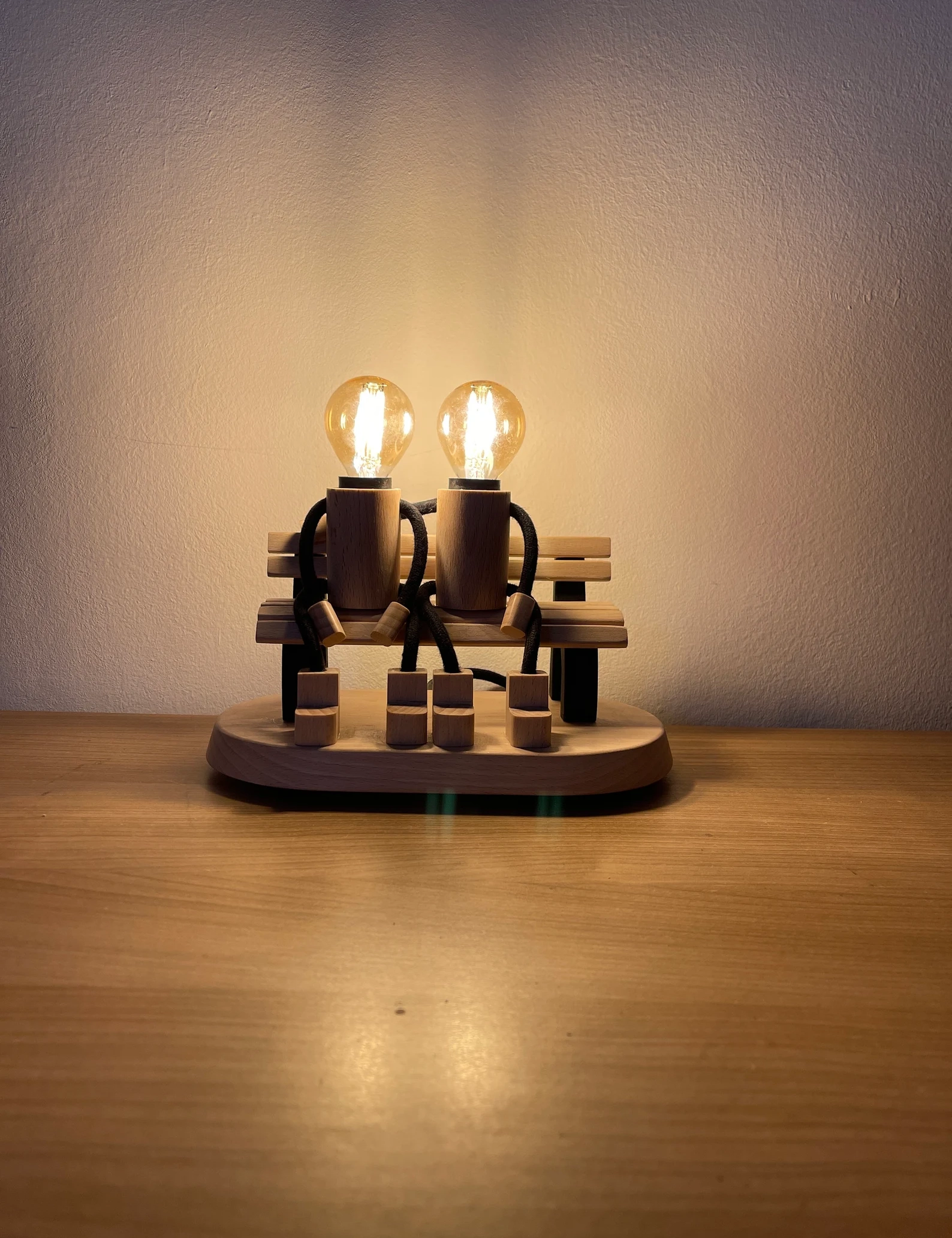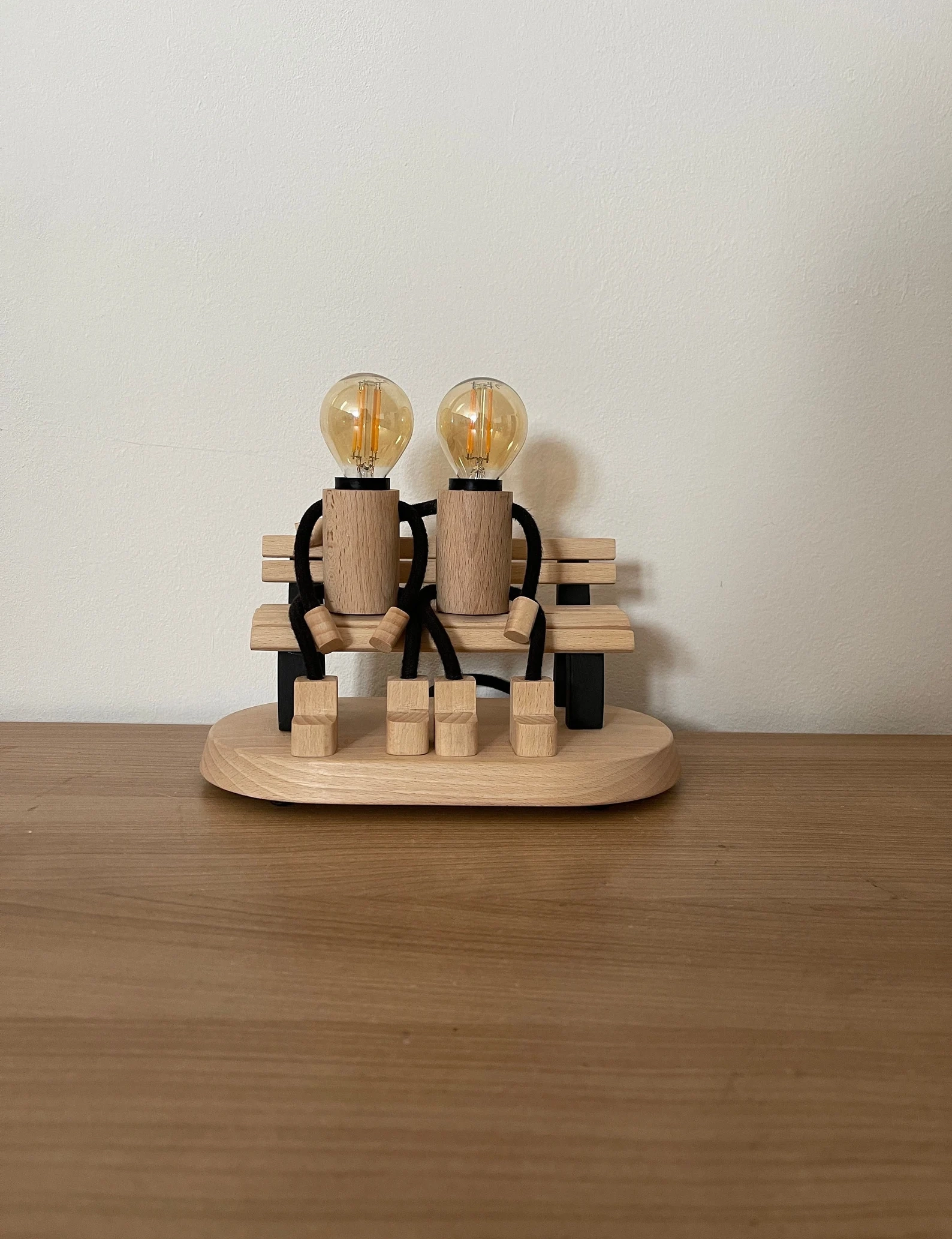 Bring warmth and emotion into your space with this beautifully handcrafted Lovers on a Bench Lamp by Krafted Kingdom. Made from solid beech wood, this table lamp captures a heartfelt moment between two wooden figures sharing a quiet seat, radiating love and connection.