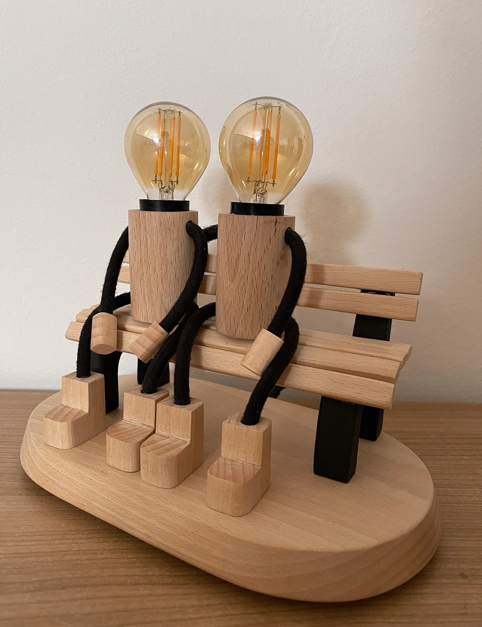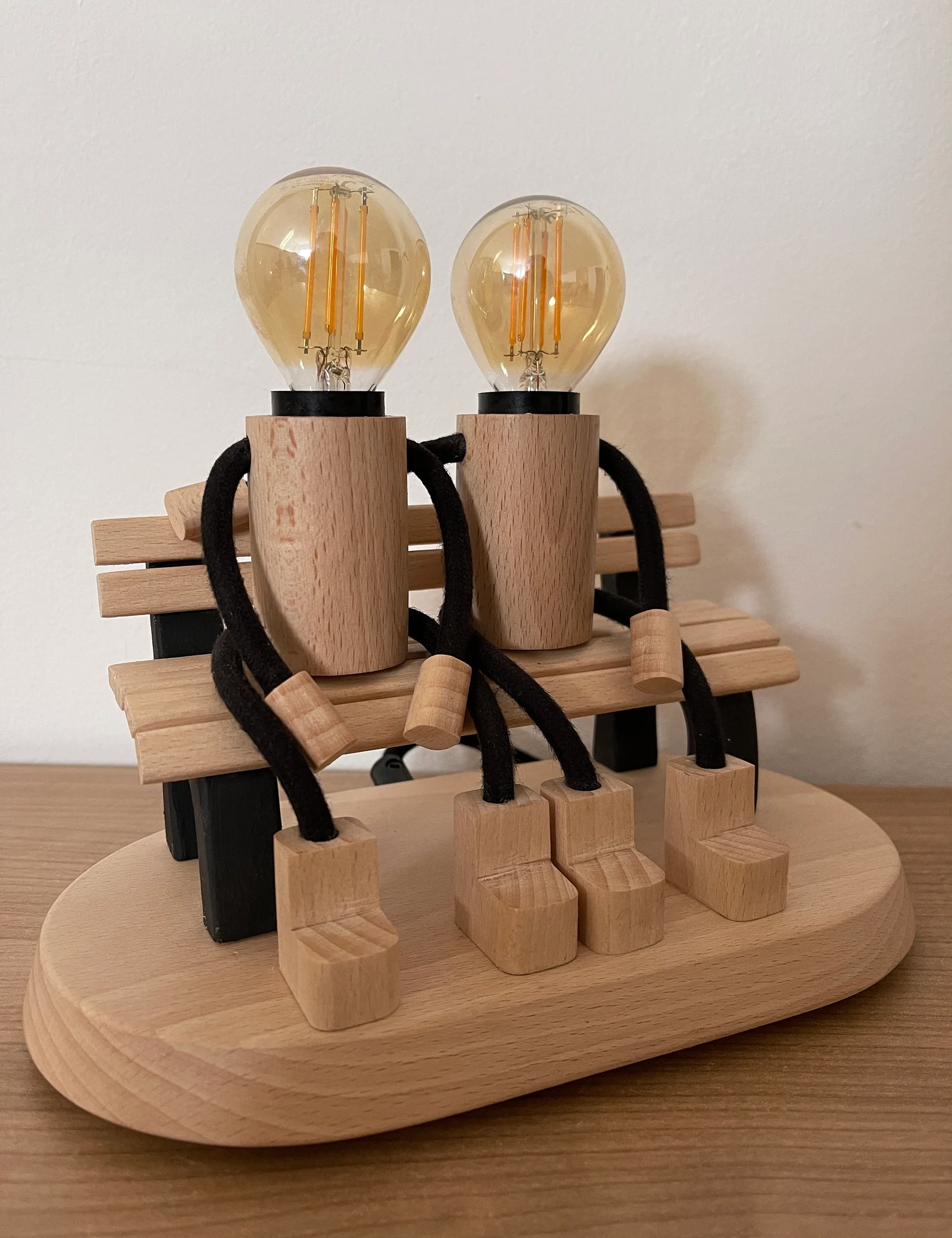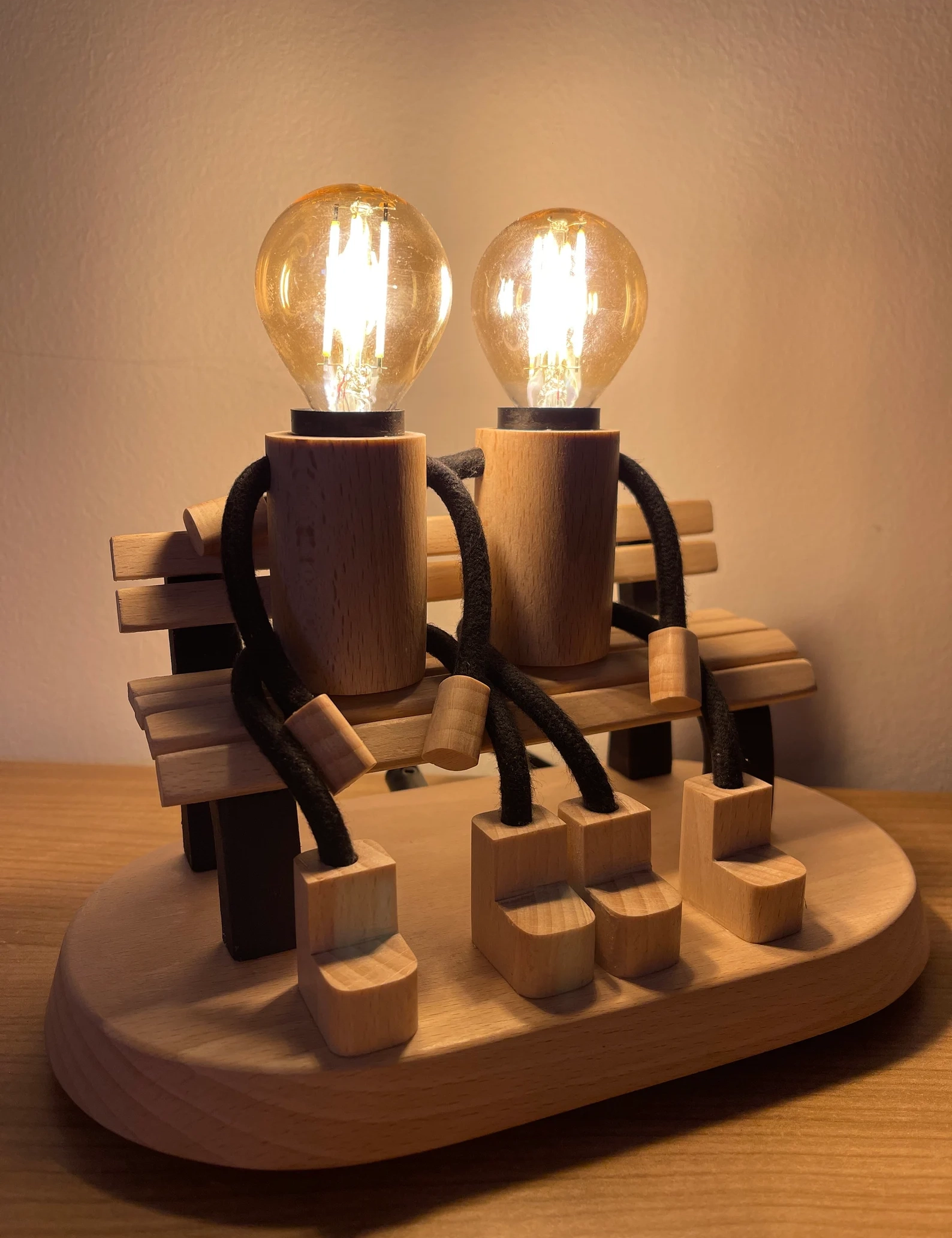 Bring warmth and emotion into your space with this beautifully handcrafted Lovers on a Bench Lamp by Krafted Kingdom. Made from solid beech wood, this table lamp captures a heartfelt moment between two wooden figures sharing a quiet seat, radiating love and connection.