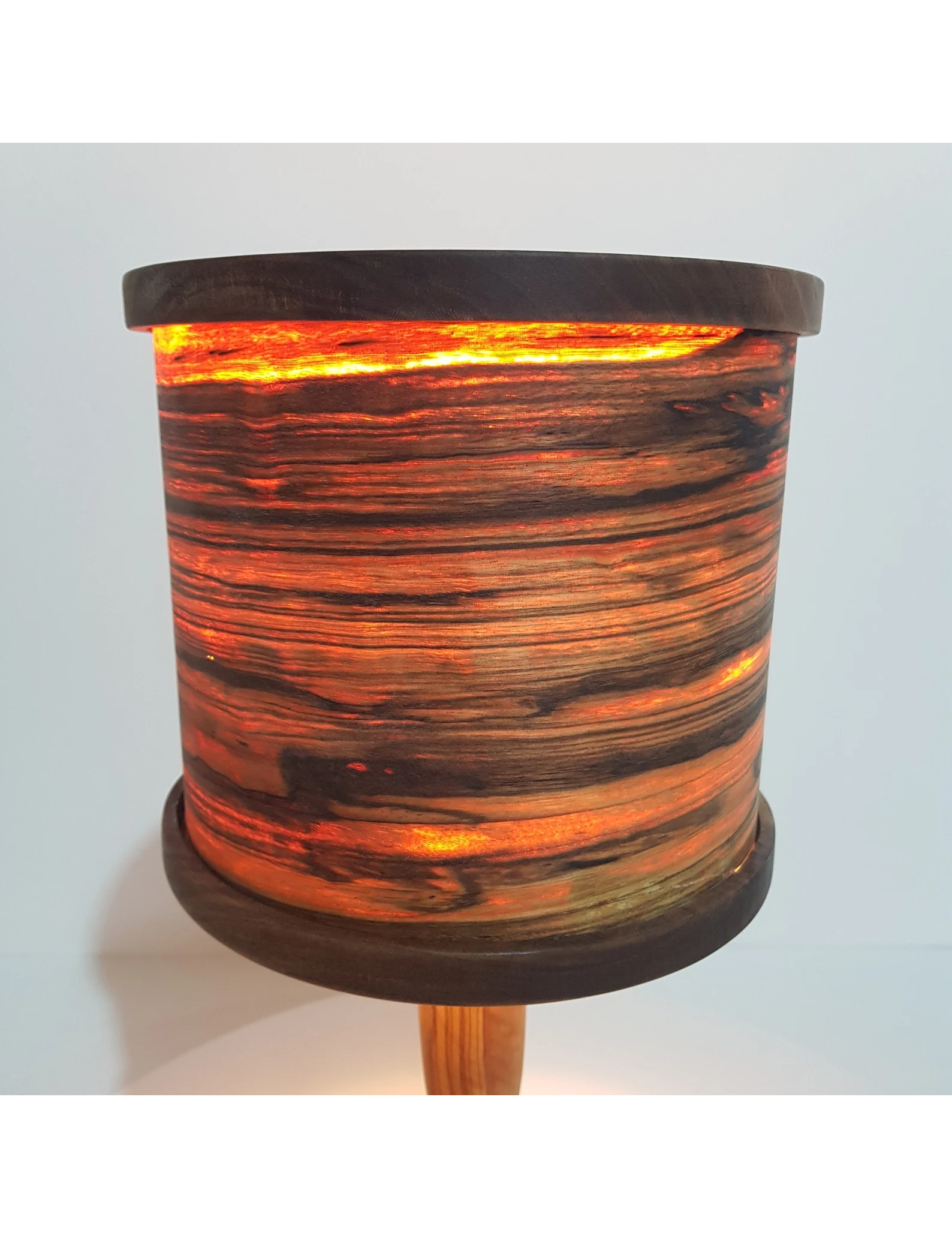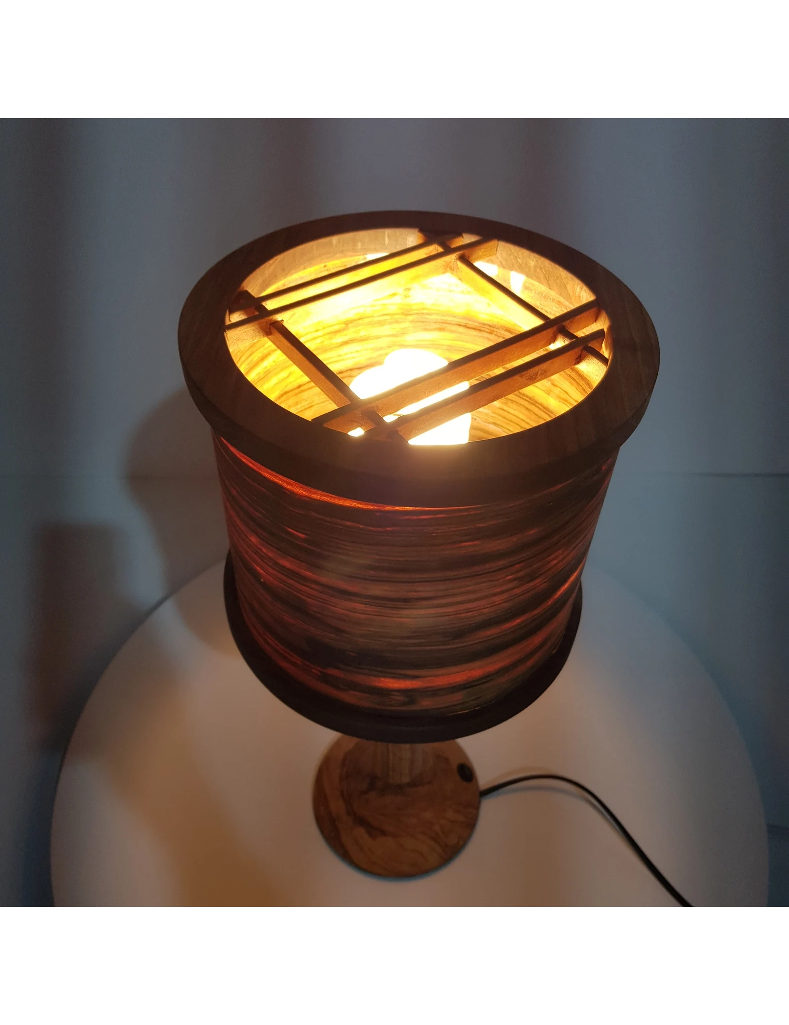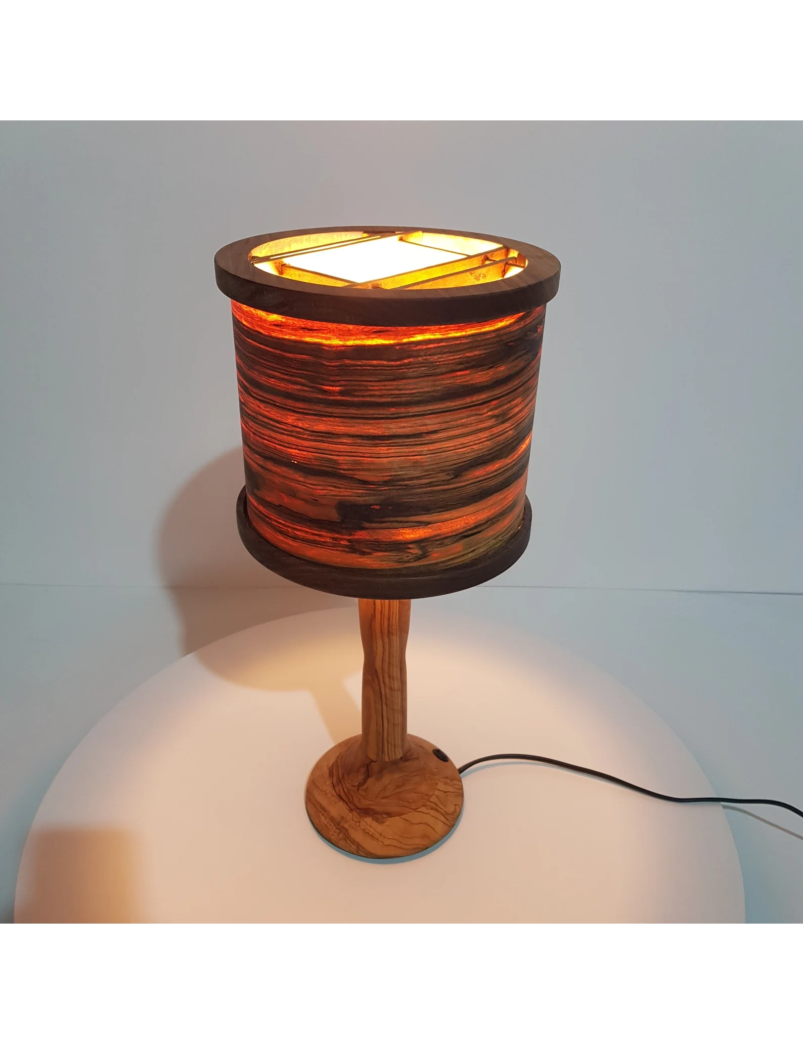 Each lamp is uniquely made by hand, so no two are ever alike. The lampshade is fashioned from real olive wood, treated with premium wood oil to preserve its beauty and enhance the grain.