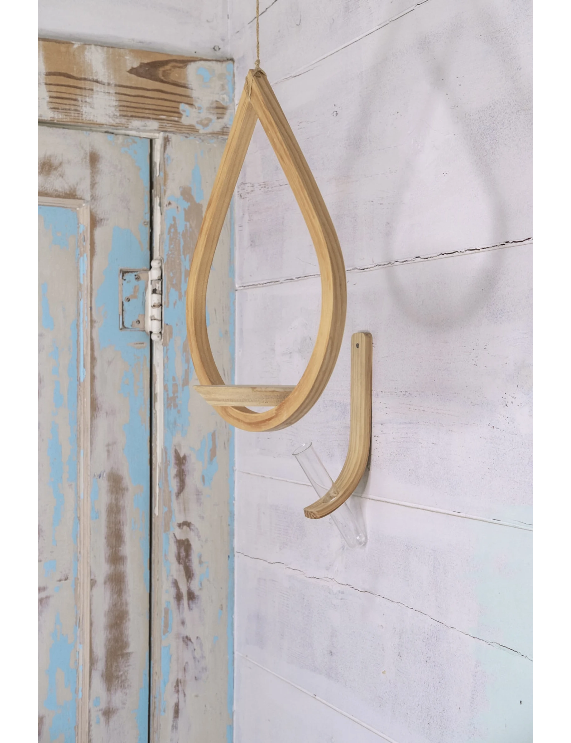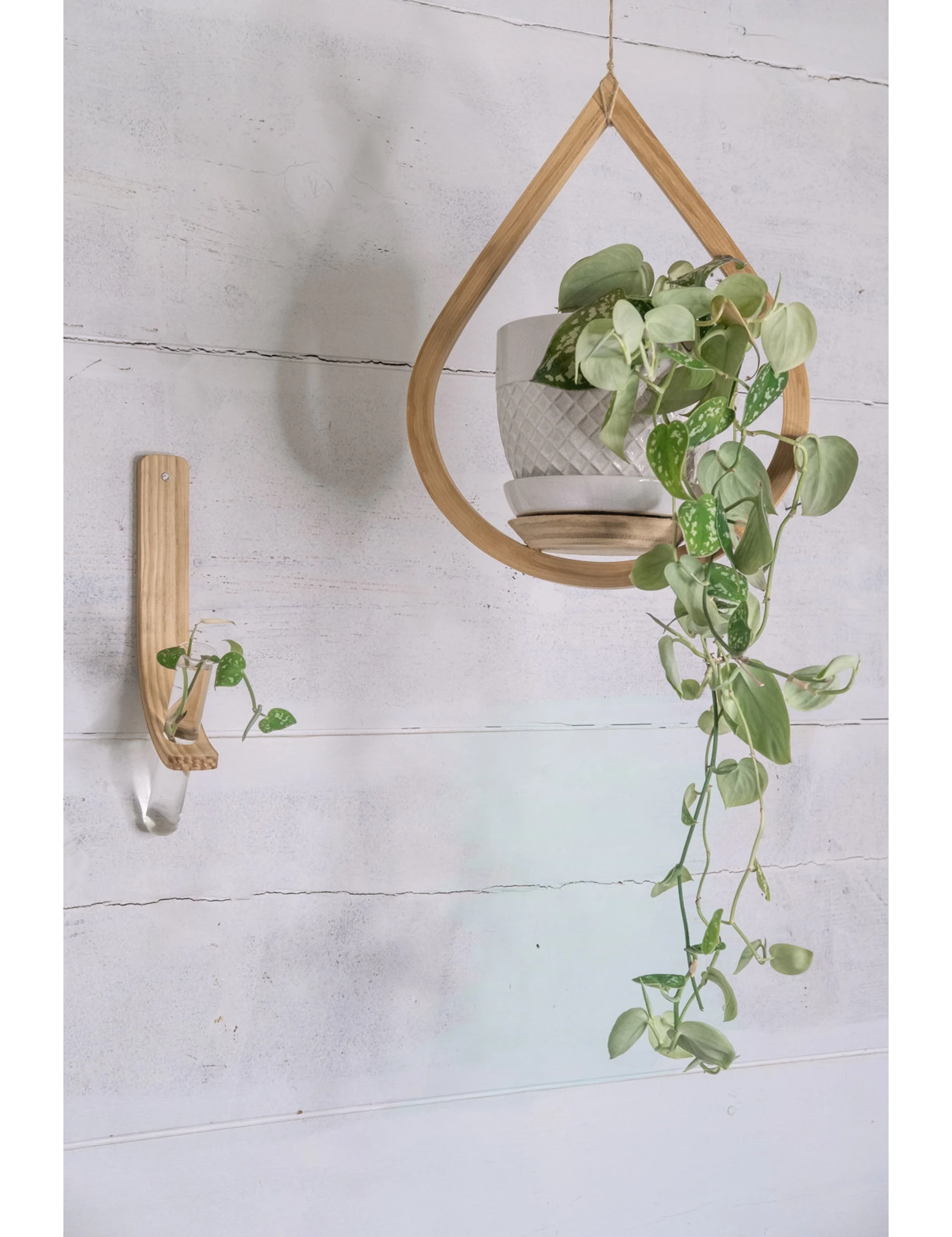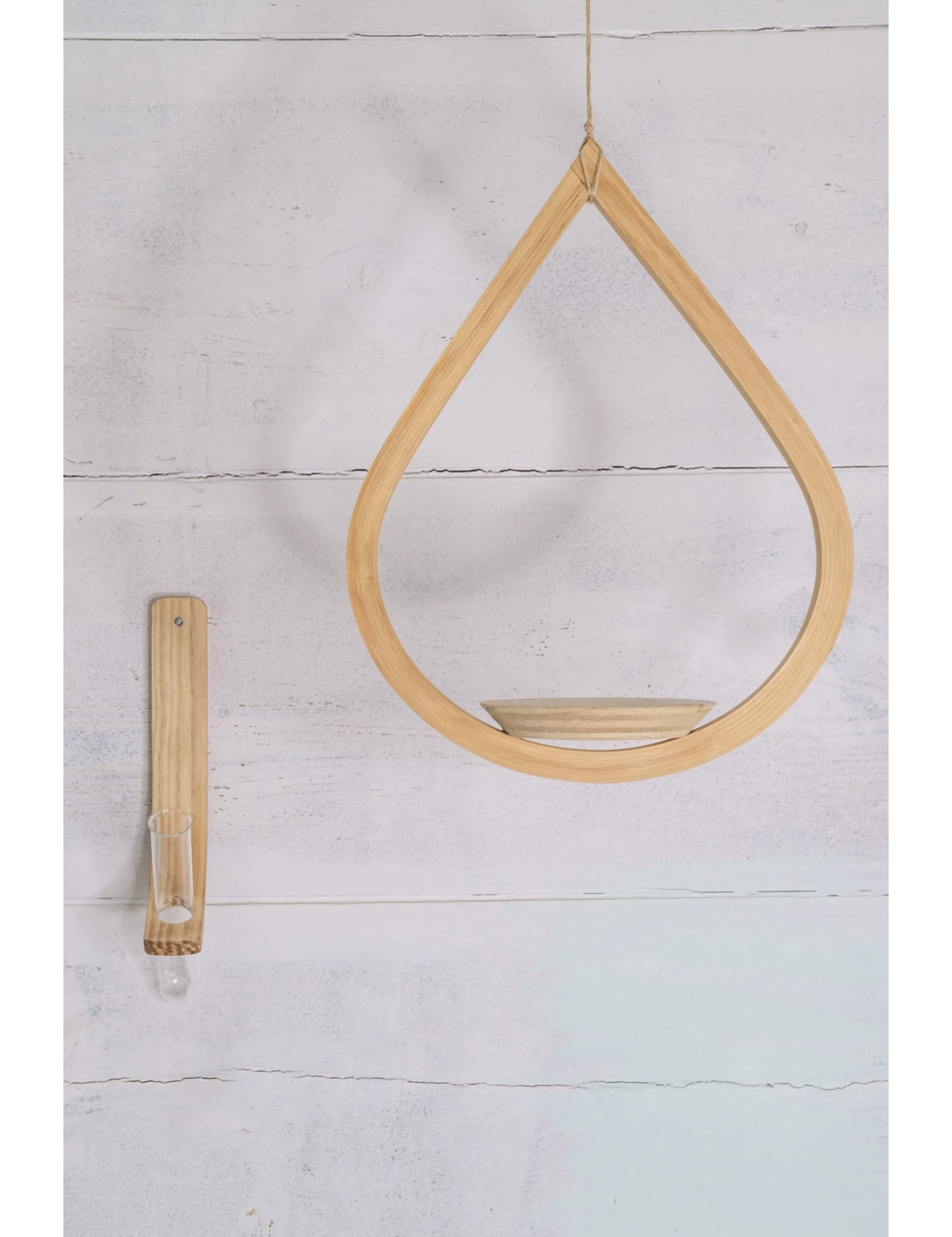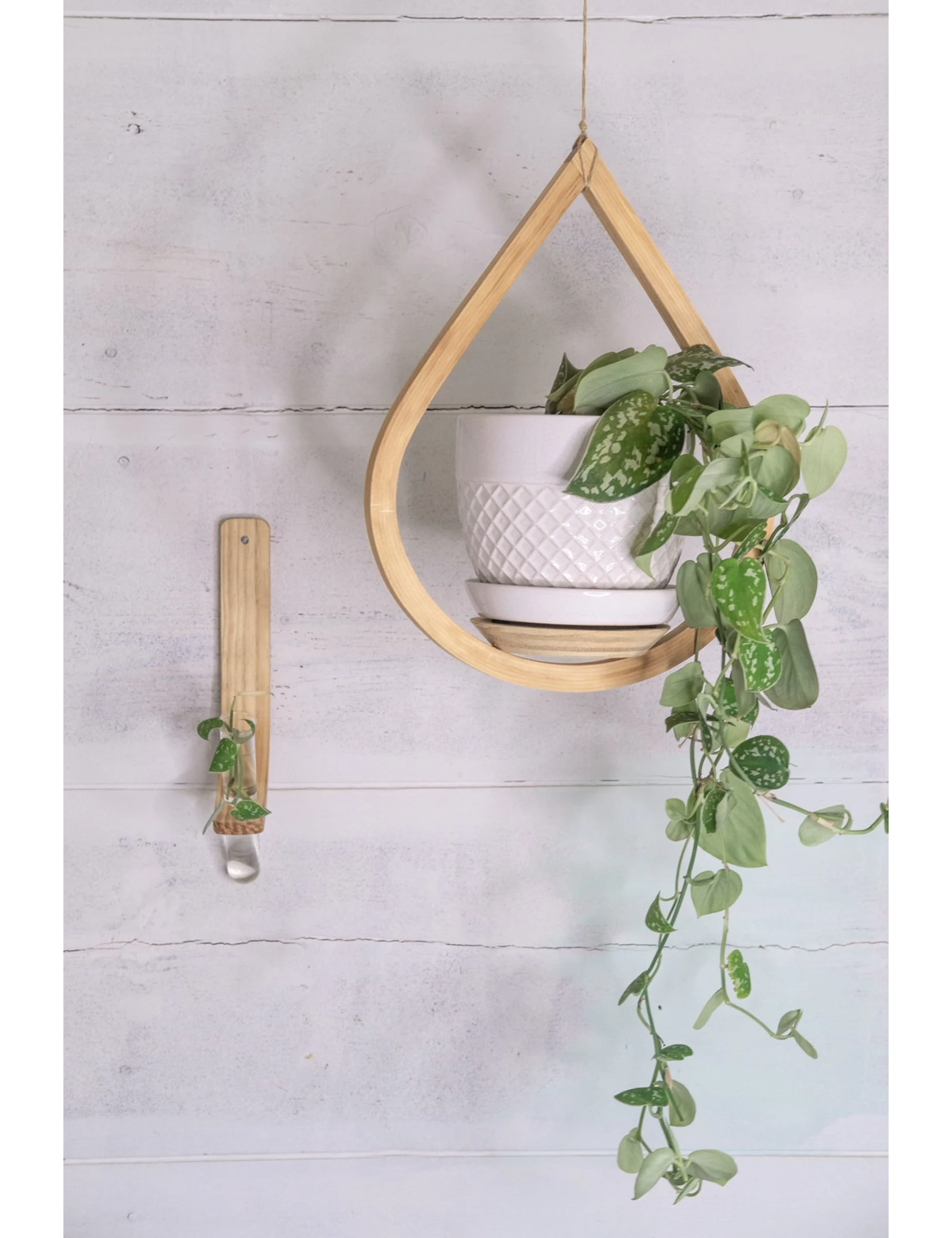 Each piece is handmade from carefully bent and doweled pine wood, then finished with natural mineral oil to highlight the grain and protect the surface. The propagation station mounts easily on the wall, while the teardrop planter hangs from natural jute rope and features a securely placed saucer to hold your potted cutting once rooted.