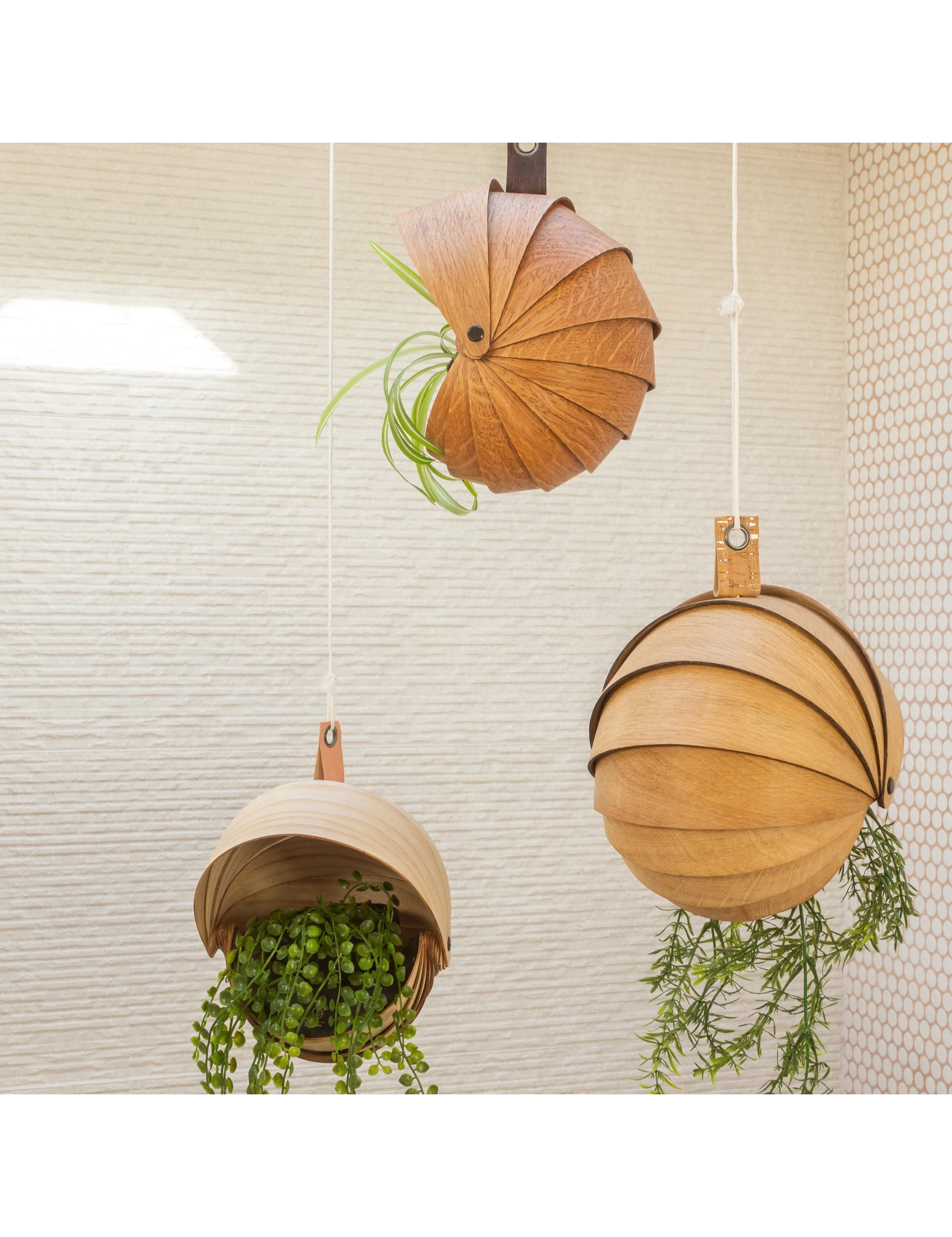 Elevate your indoor greenery with this handcrafted Spiral Wooden Hanging Planter by Krafted Kingdom. Designed using the low-waste art of steam bending, each segment curves gracefully outward, forming a sculptural spiral that beautifully complements trailing plants. The sleek black stainless-steel plate securely cradles the included pot, allowing your plants to cascade naturally.