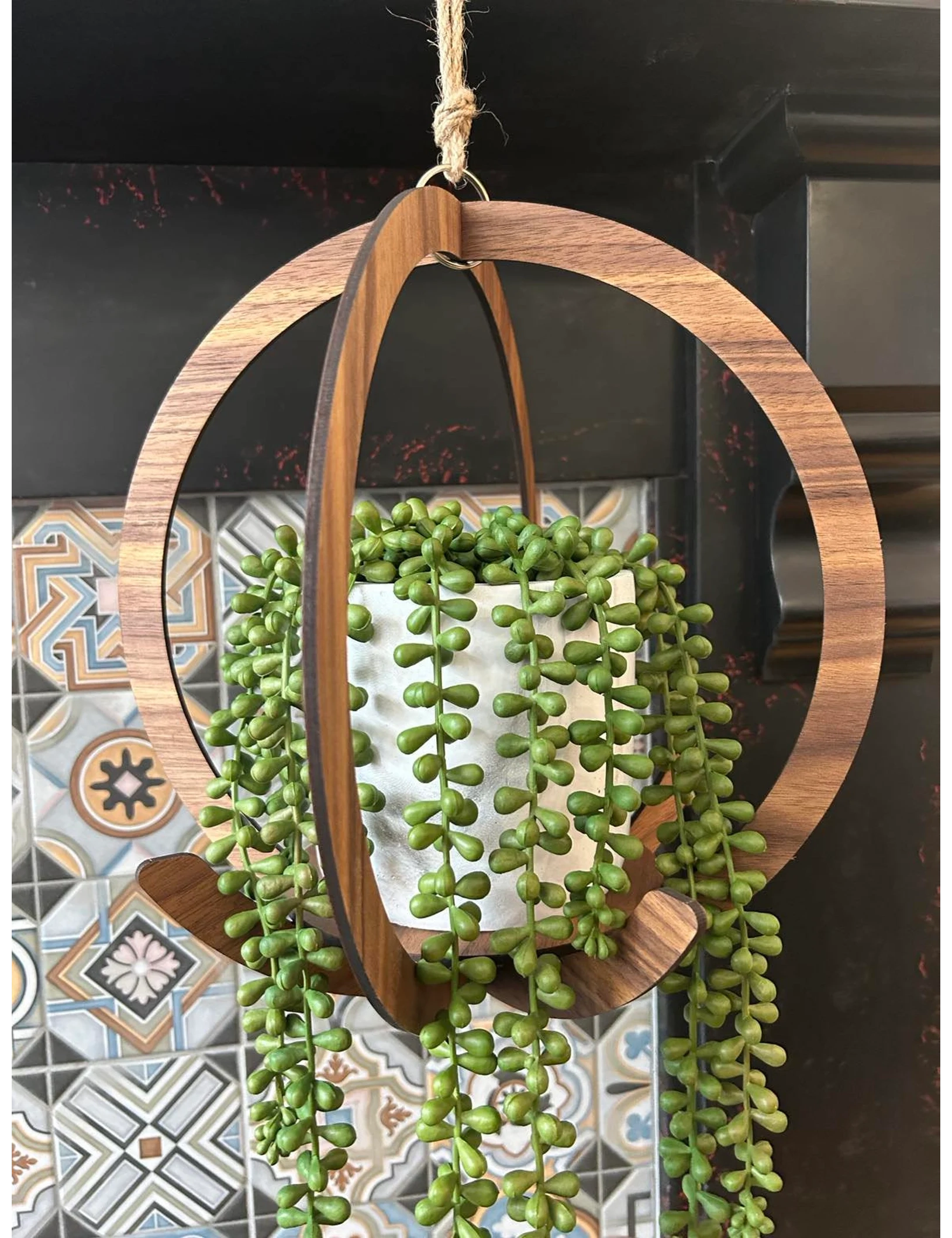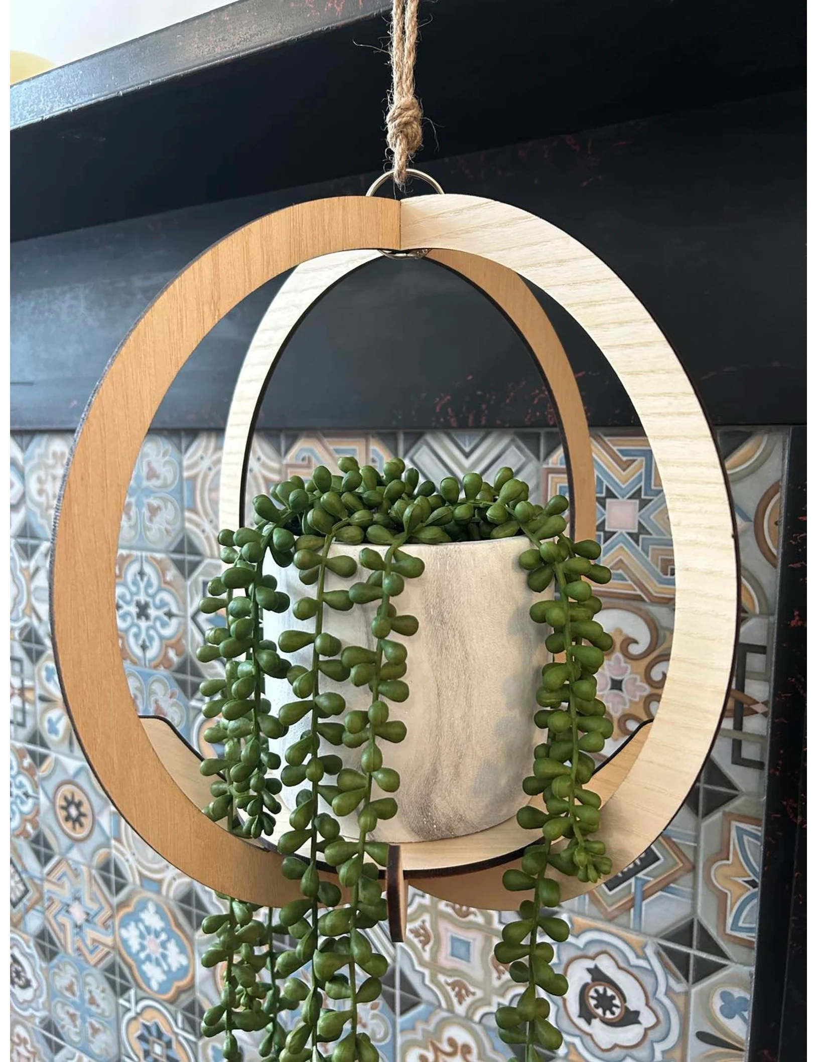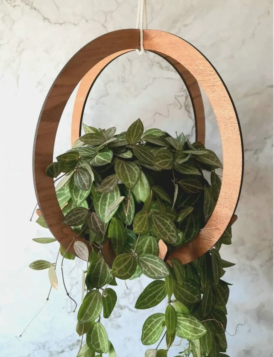 Add sculptural elegance to your indoor garden with our Wooden Circular Plant Hanger, handmade by Krafted Kingdom. This full-sized design offers a stunning way to elevate your potted or trailing plants, while enhancing your home with warm wooden textures and cozy, plant-filled vibes. Carefully crafted using 4mm thick veneered wood and suspended with durable cotton macrame rope, each piece is thoughtfully finished to perfection.