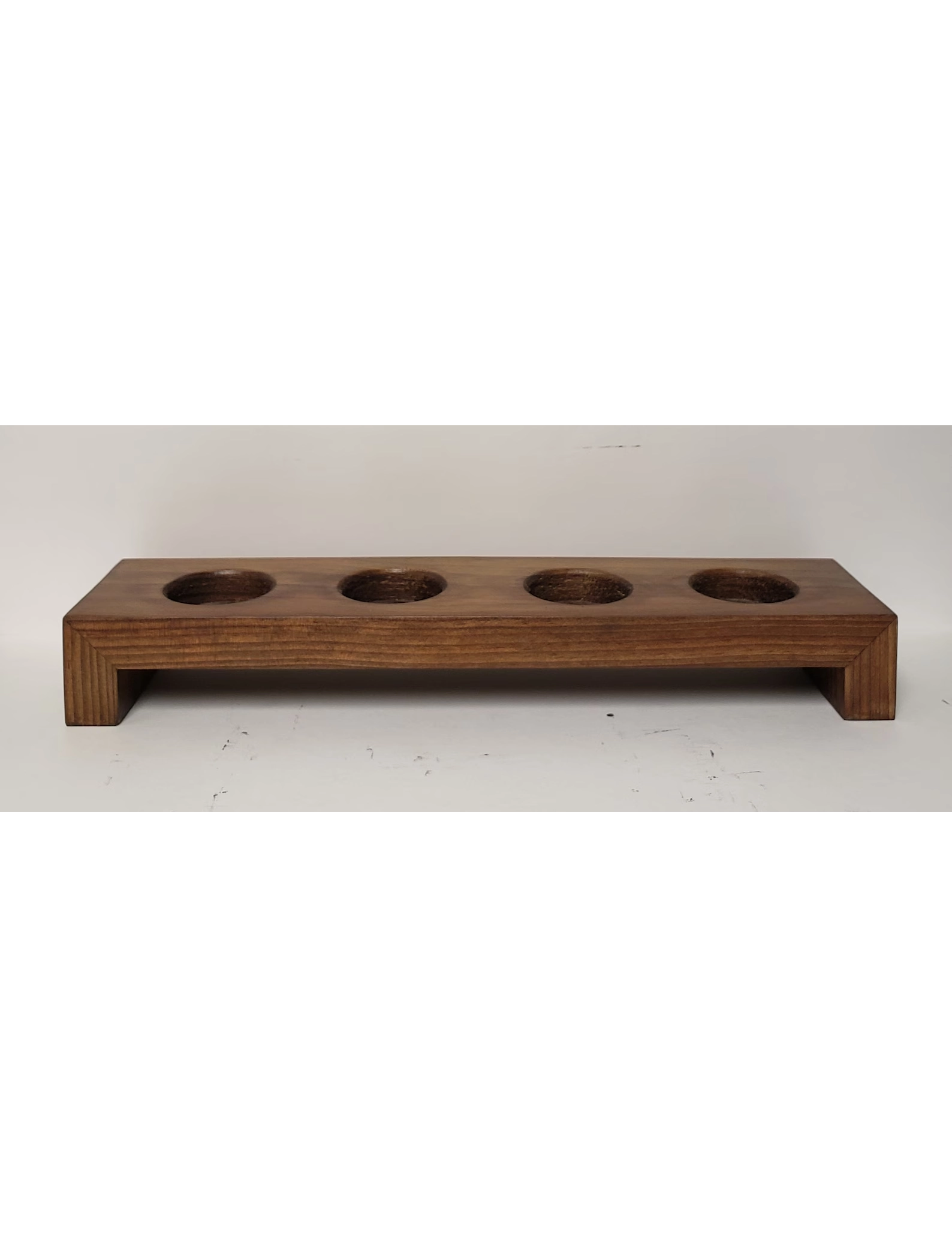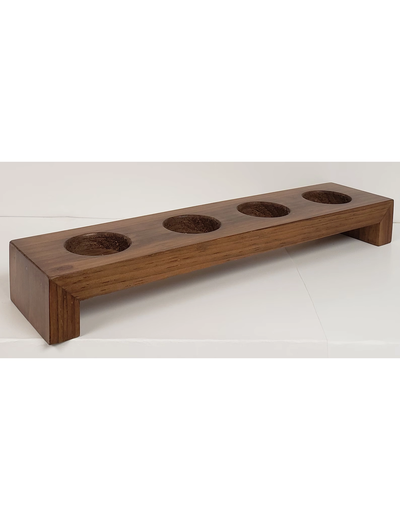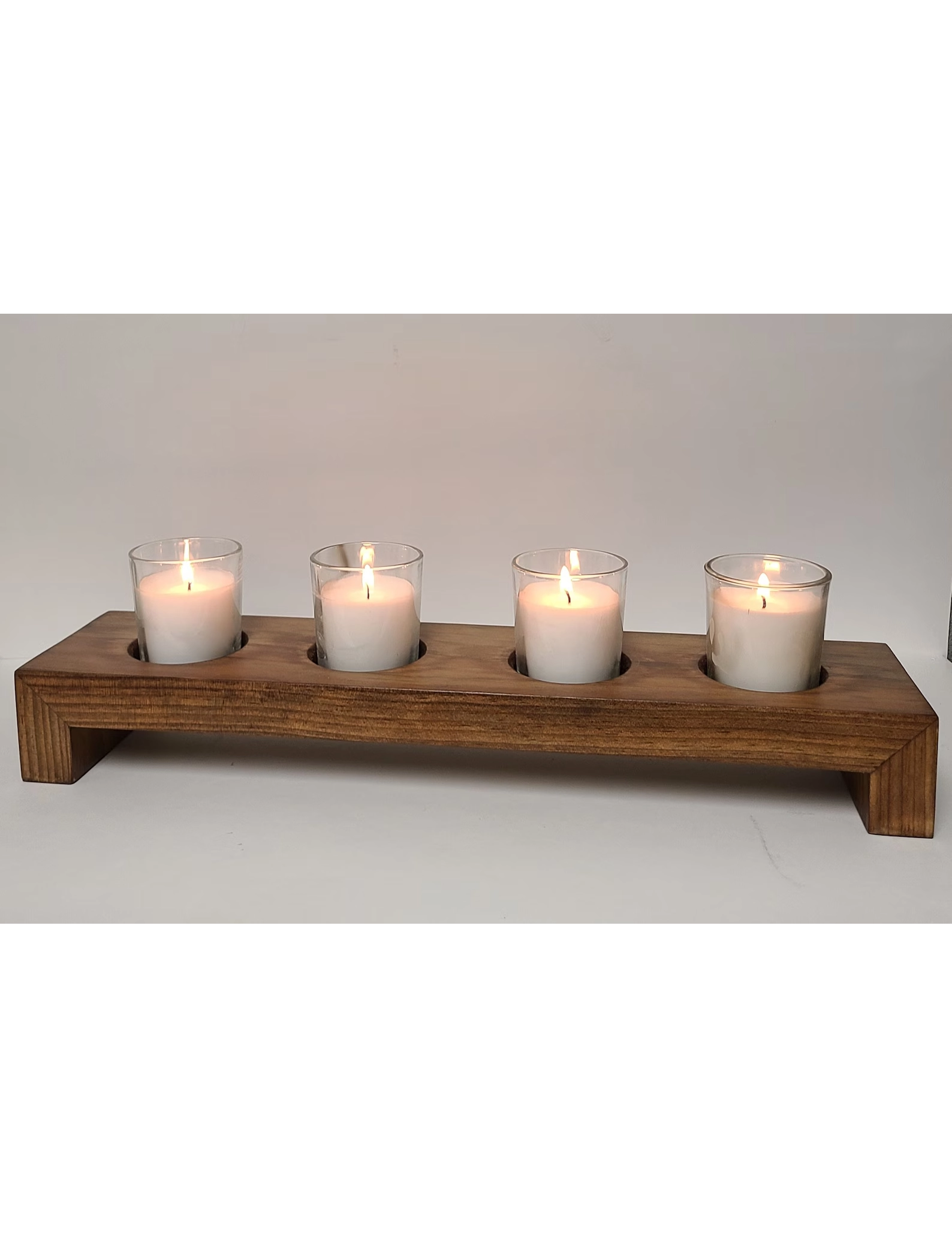 This sleek design holds four standard 2-inch votive candles (not included), making it ideal for dining tables, mantels, weddings, or entryways. A hand-applied vinegar stain brings out the natural grain and character of the wood, ensuring every holder has its own unique charm.