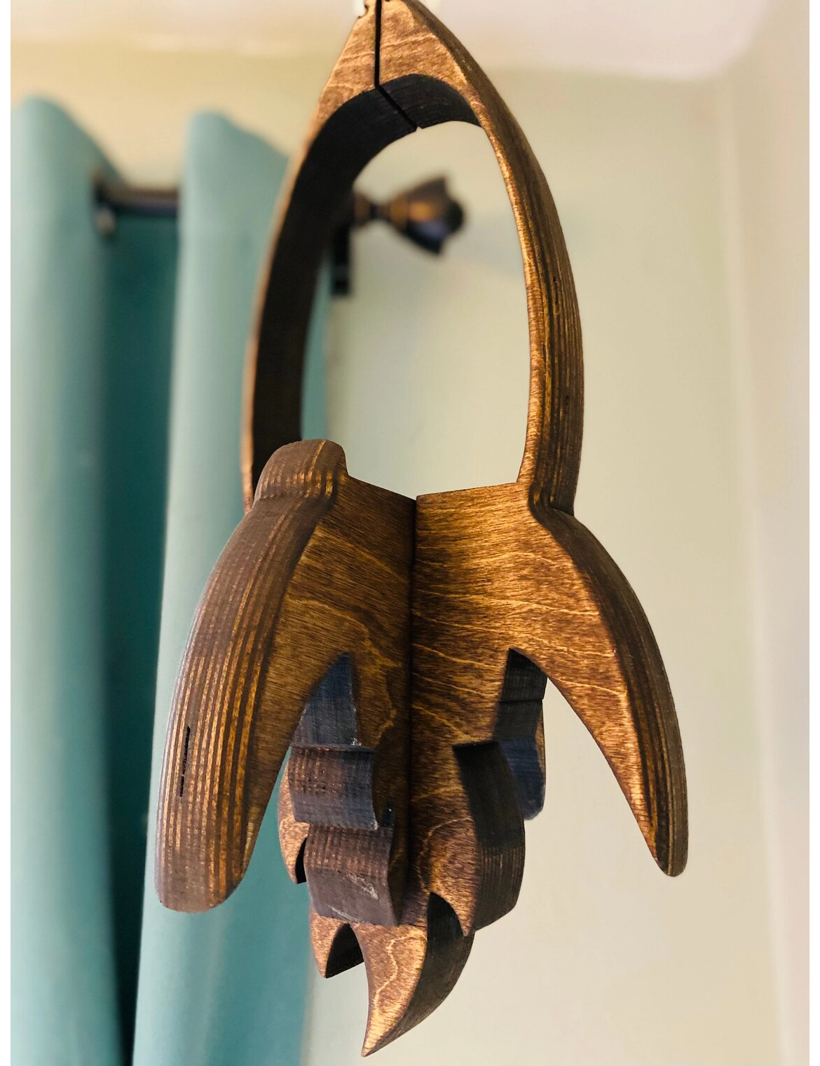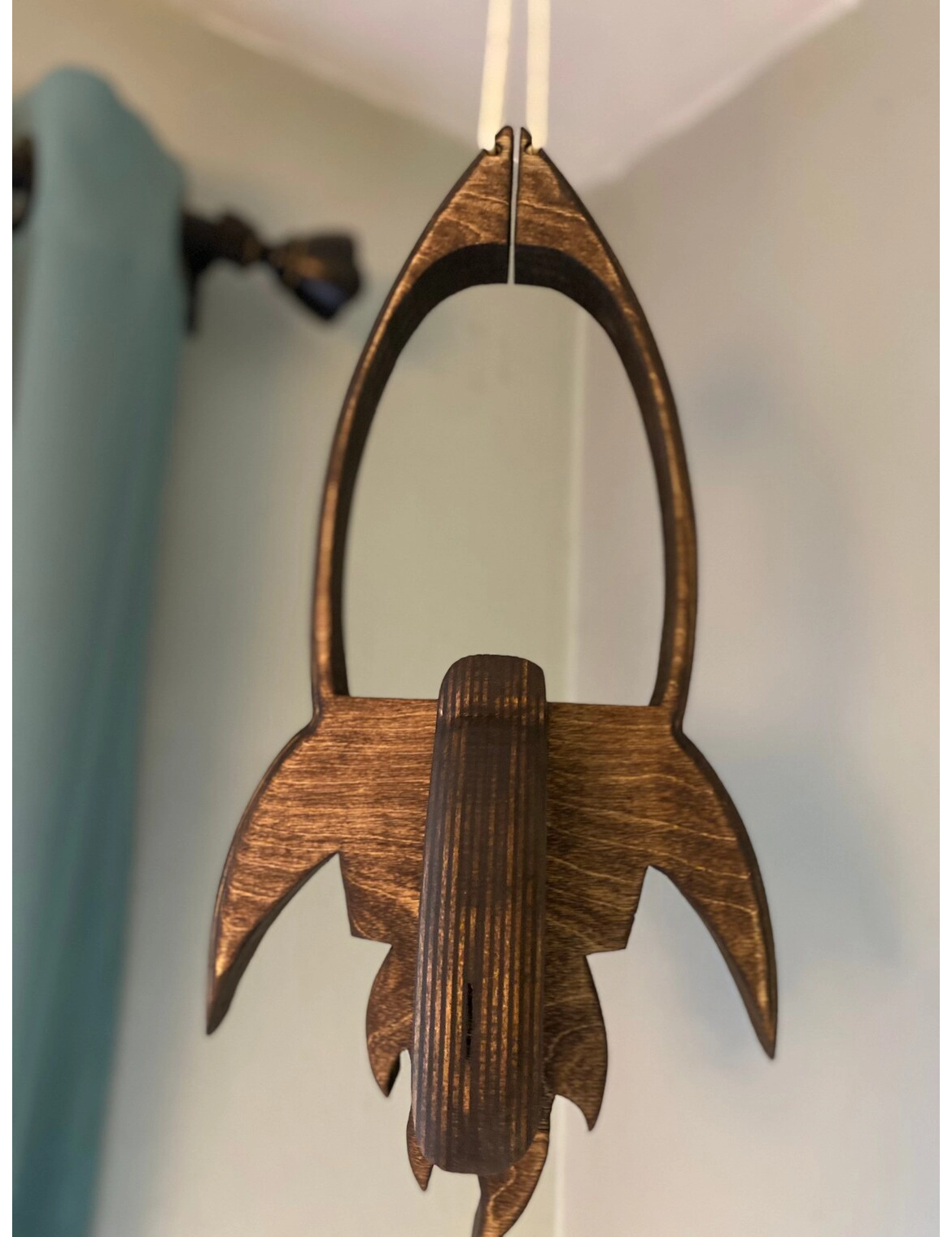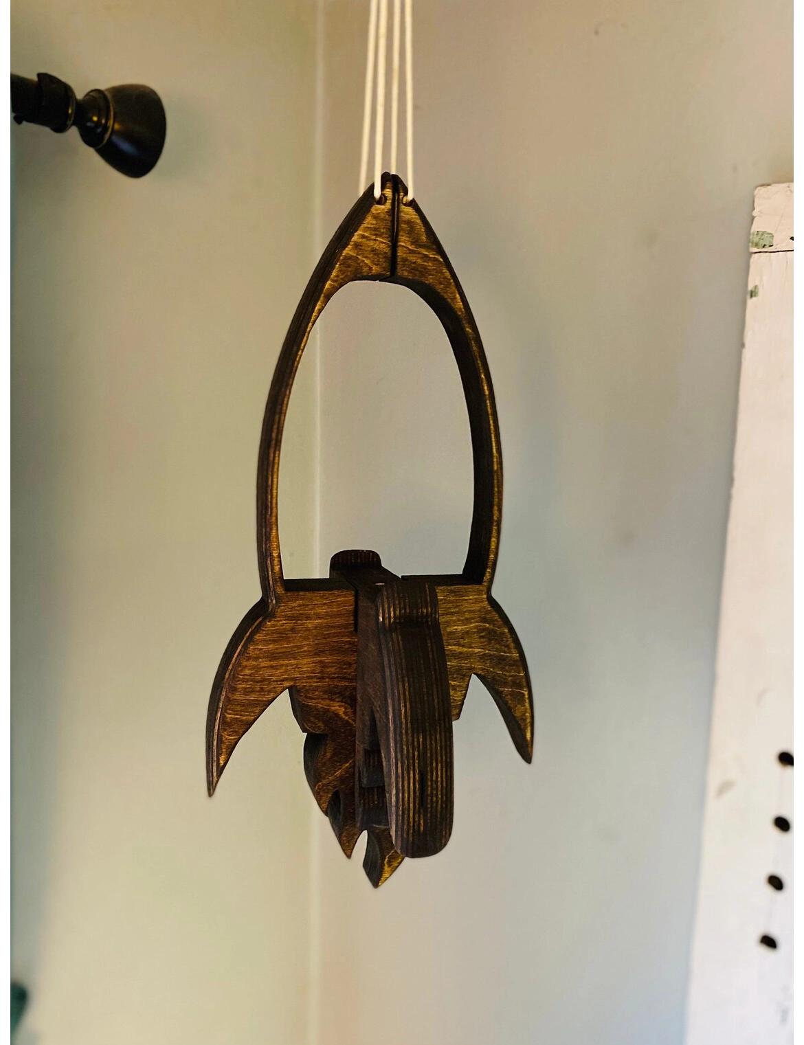 Handmade to order from sustainable wood, the rocket measures 17” tall and 9” wide, with an interior space of 5” × 7”. It hangs from a cord and comes in your choice of finish—from a deep espresso stain to red chestnut or a beautifully textured burned style.