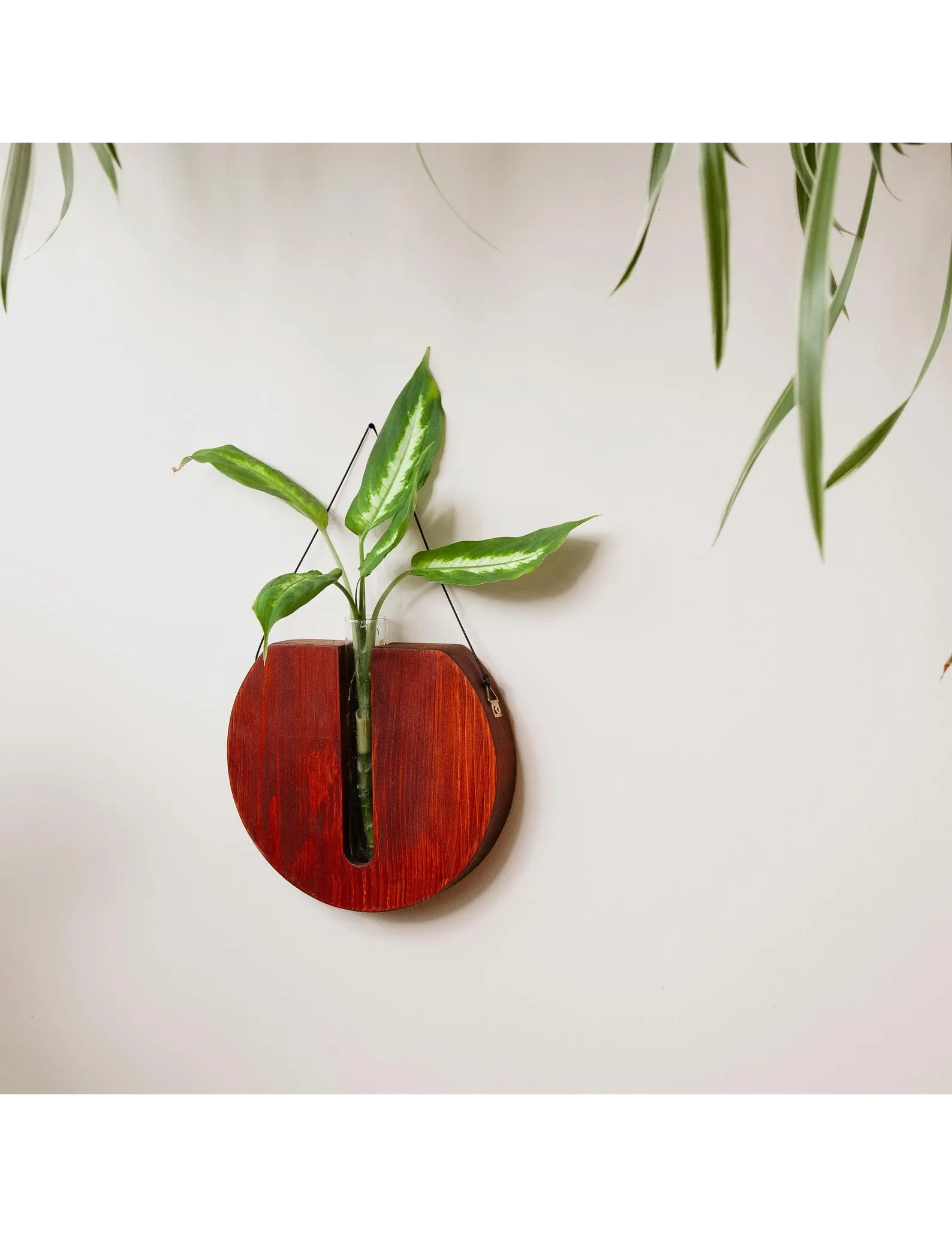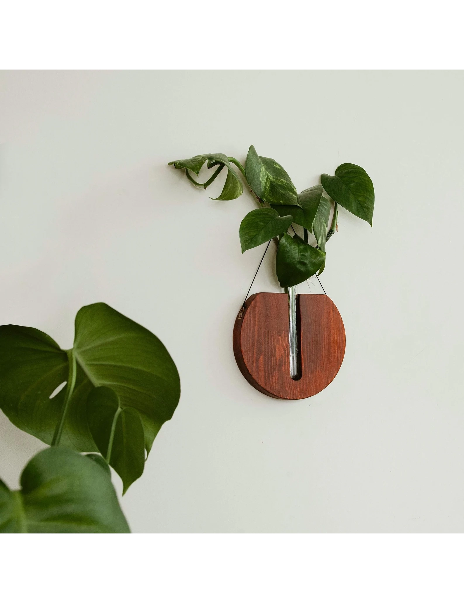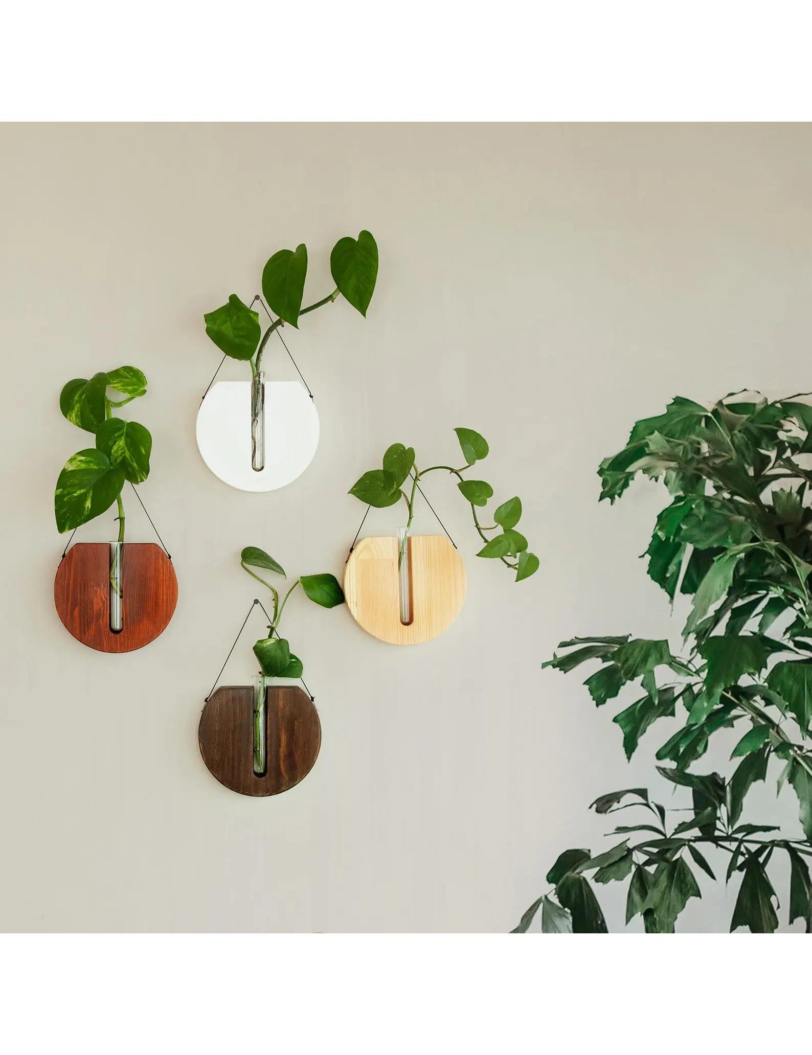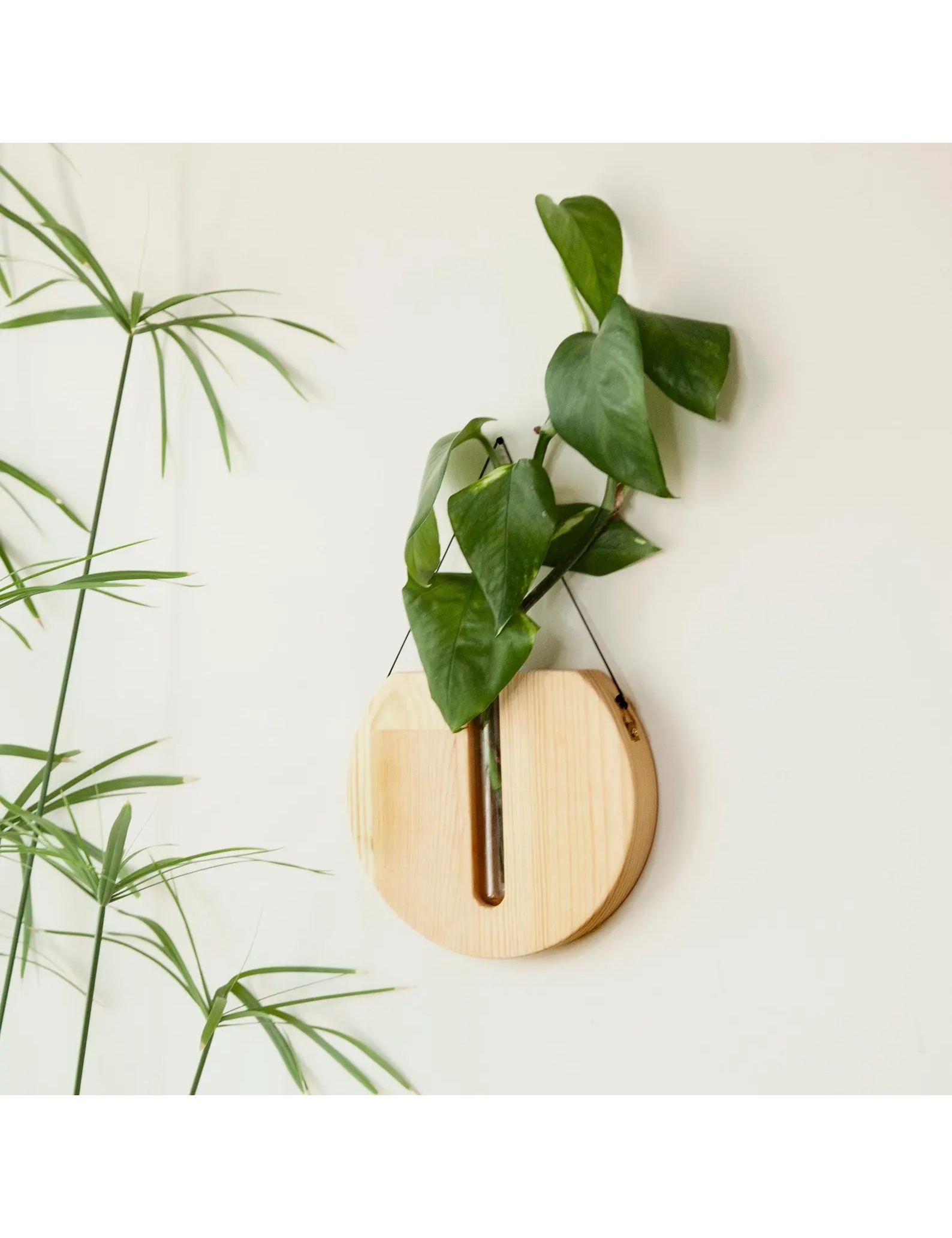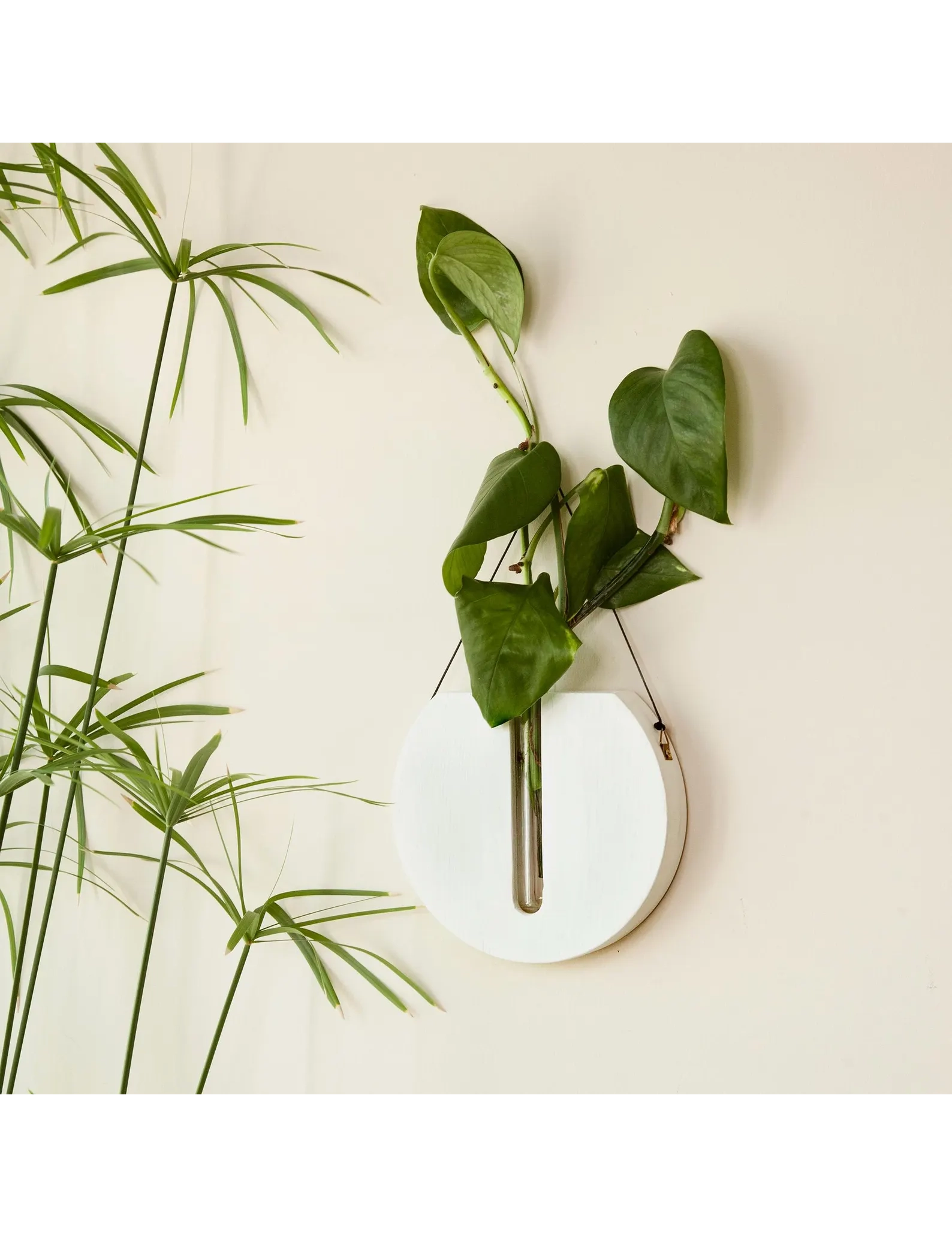 The smooth round shape adds softness to your walls, making it a versatile décor piece for modern, boho, farmhouse, or minimal interiors. Each planter includes a test tube vase for your plant displays and a strong natural cord for effortless hanging—no tools or complex installation required.