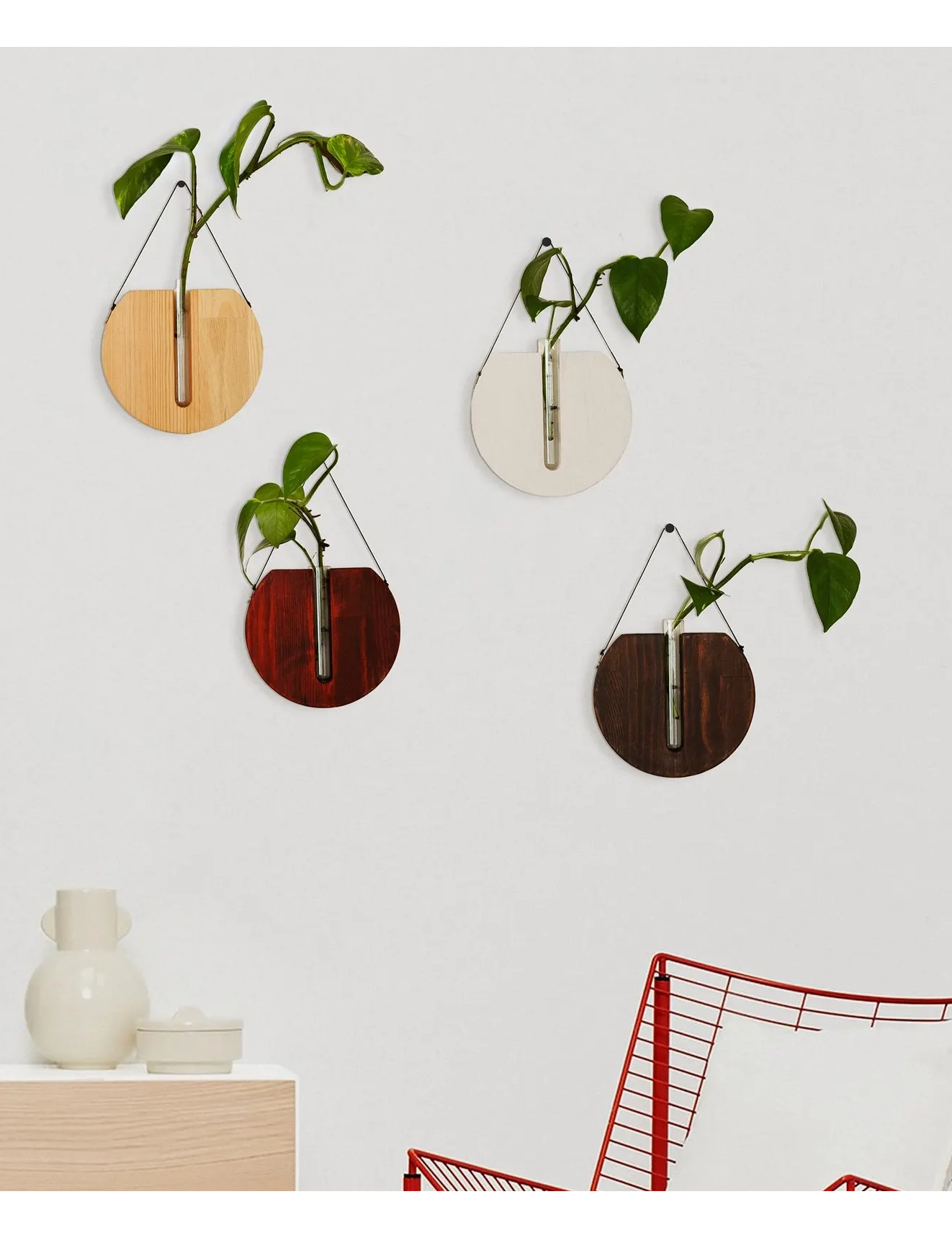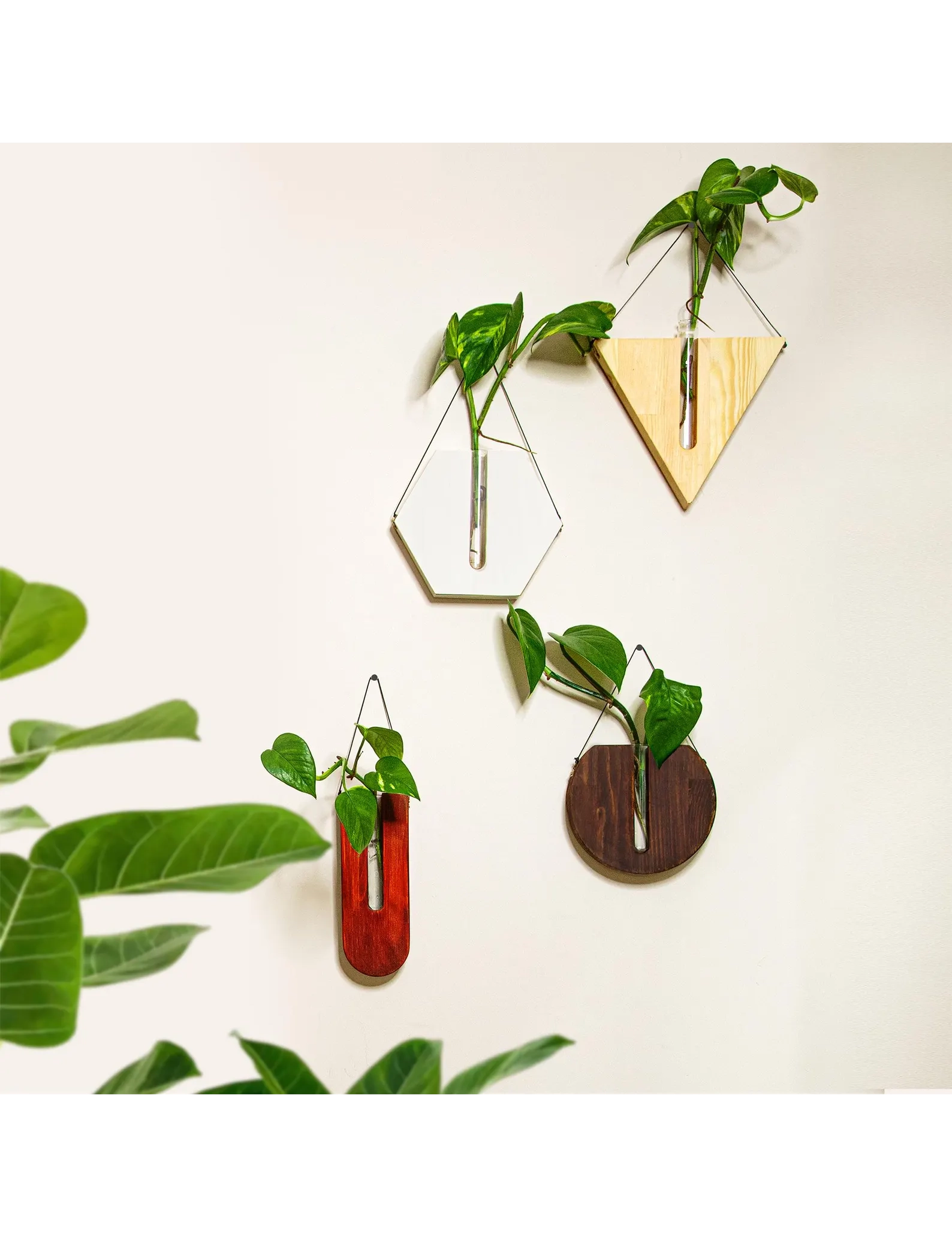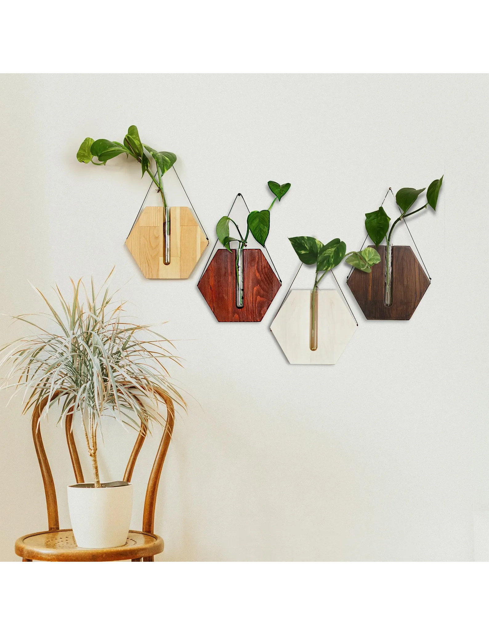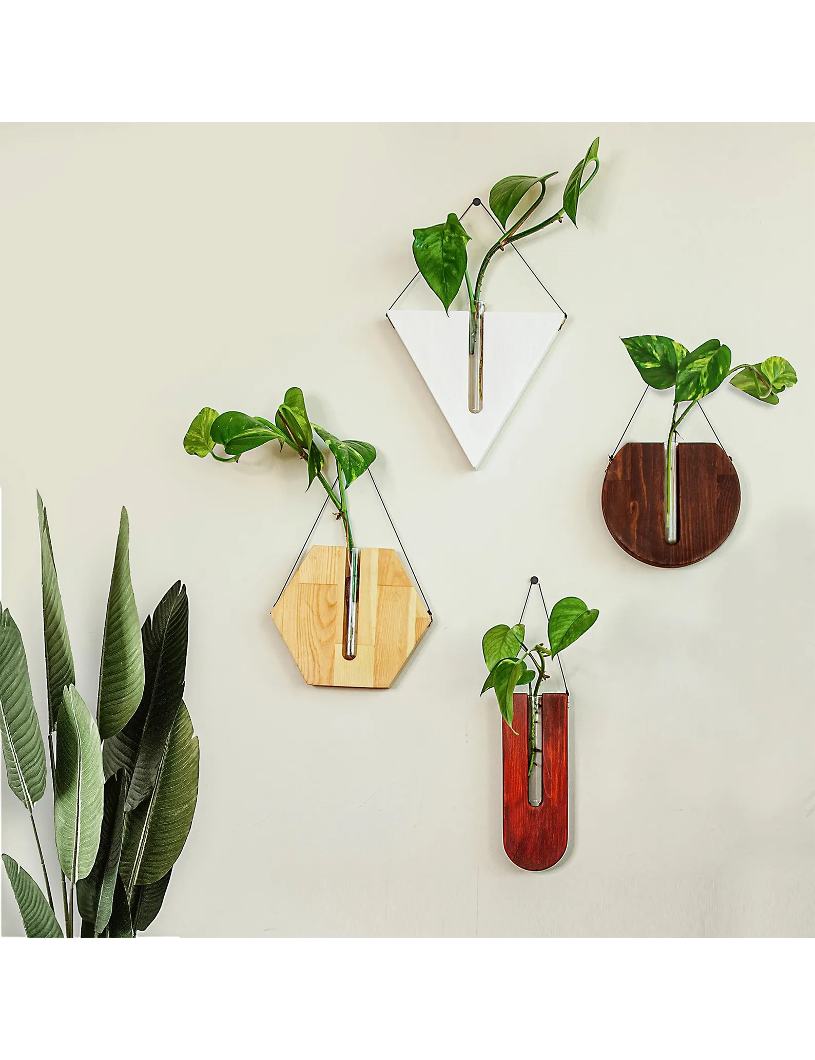 Bring a warm, handcrafted touch to your walls with this Set of 4 Wooden Wall Vases by Krafted Kingdom. Perfect for showcasing your favorite succulents, air plants, or plant cuttings, each piece includes a glass propagation tube for functional and decorative display.