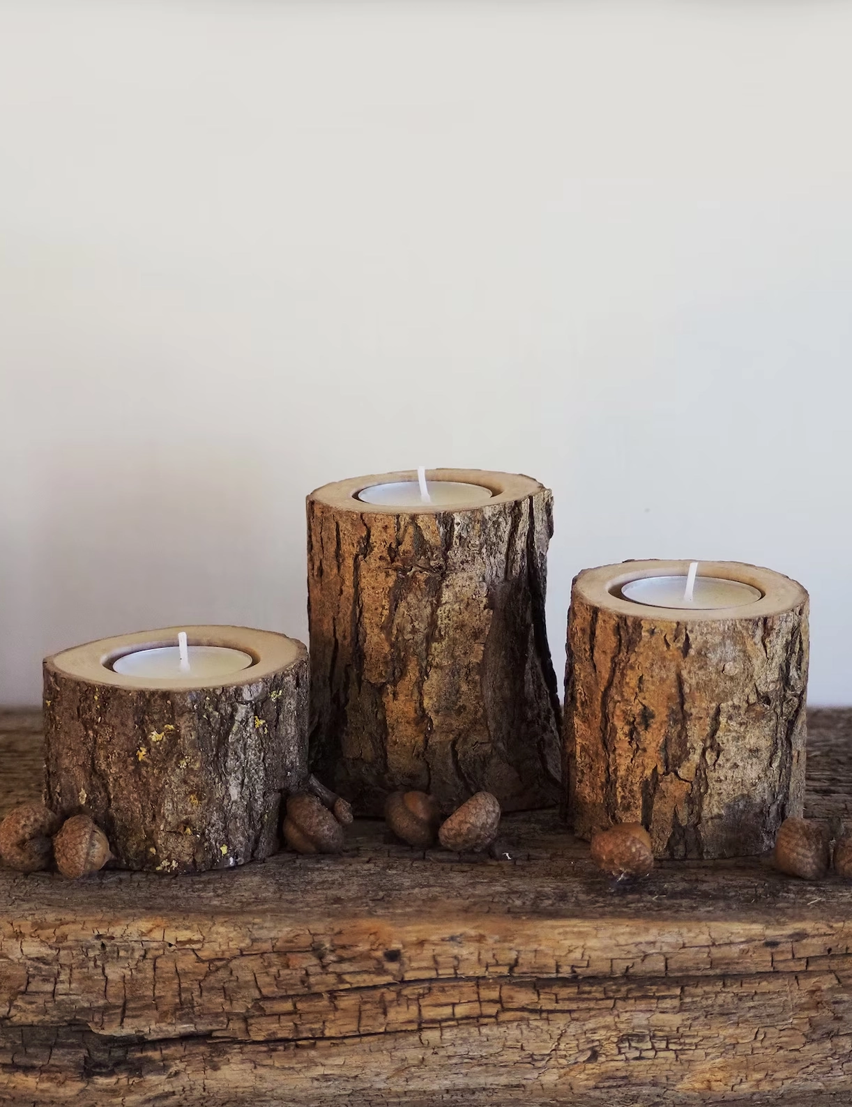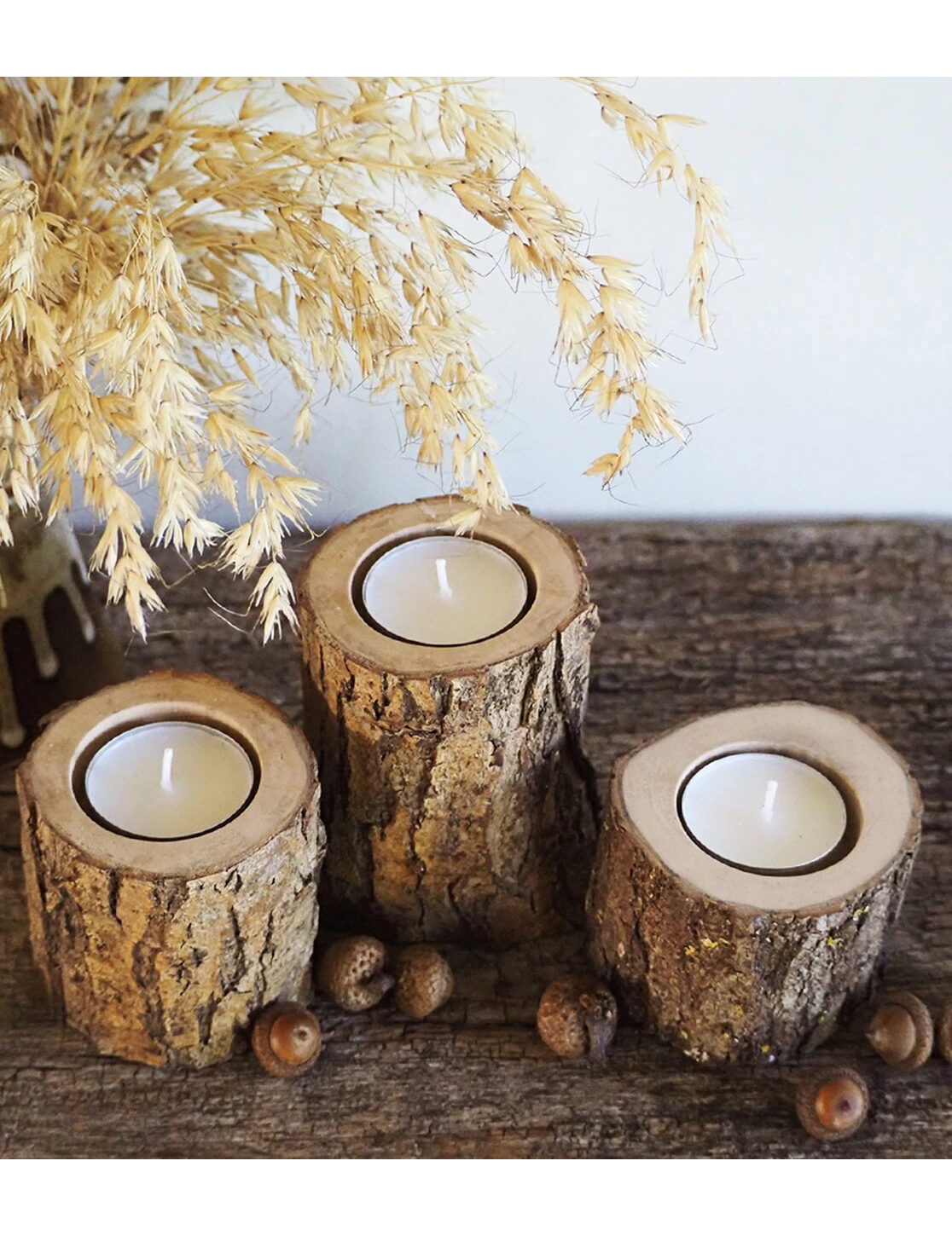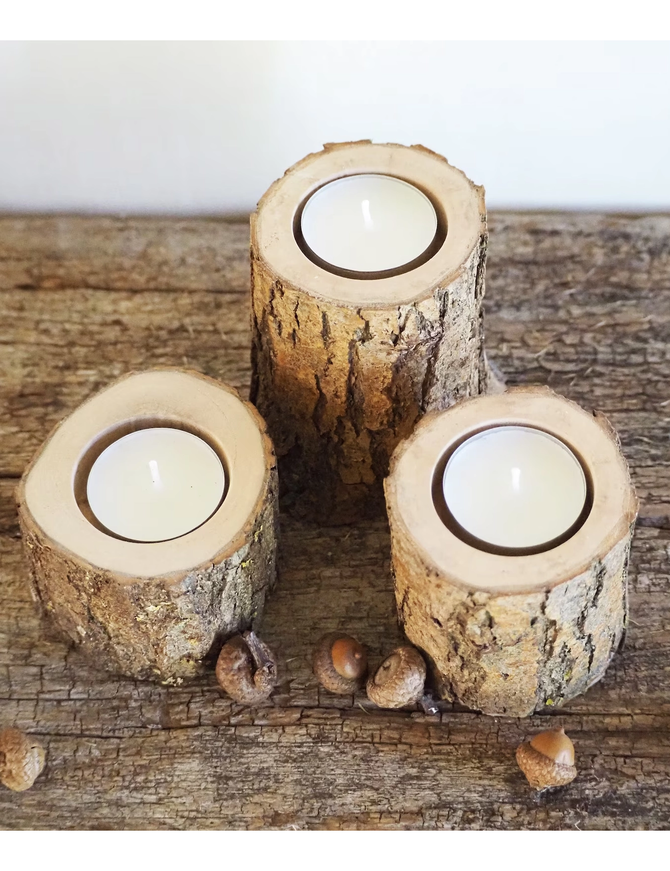 Bring warmth and nature indoors with this set of 3 handcrafted tree branch tealight holders. Perfect for cozy hygge decor, rustic interiors, or as a thoughtful 5th-anniversary gift. Each piece is uniquely made from natural wood, tea lights included.