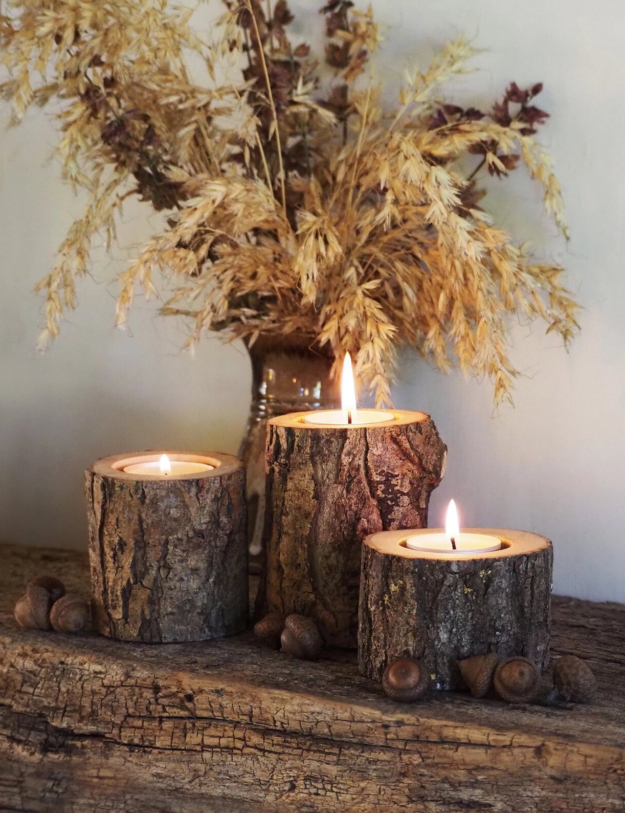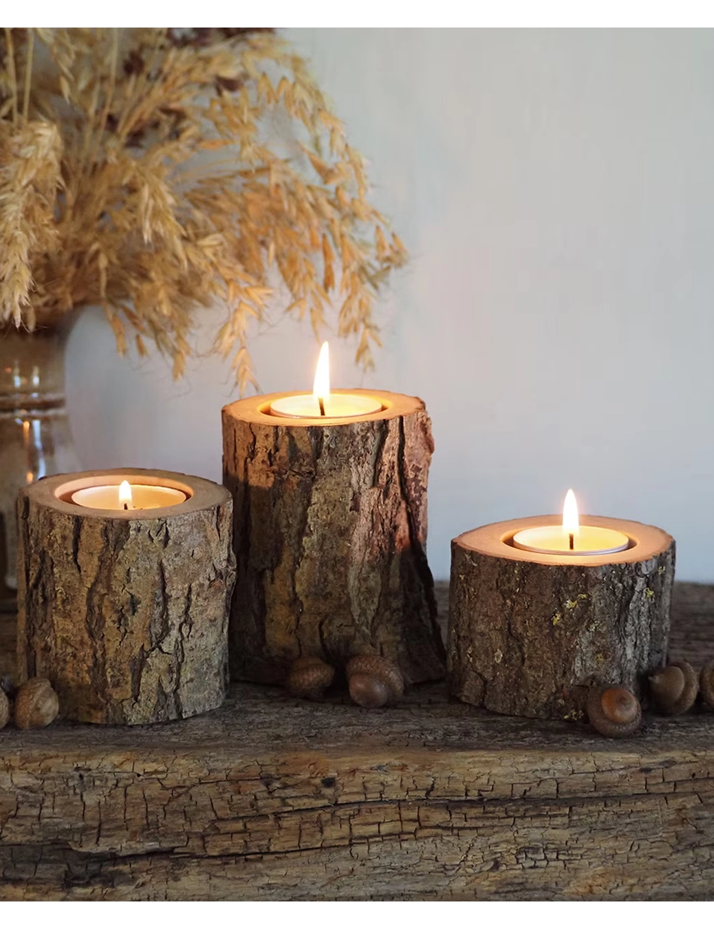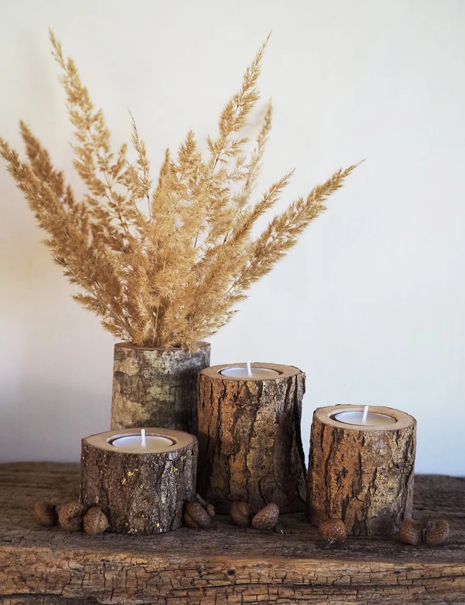 Bring warmth and nature indoors with this set of 3 handcrafted tree branch tealight holders. Perfect for cozy hygge decor, rustic interiors, or as a thoughtful 5th-anniversary gift. Each piece is uniquely made from natural wood, tea lights included.