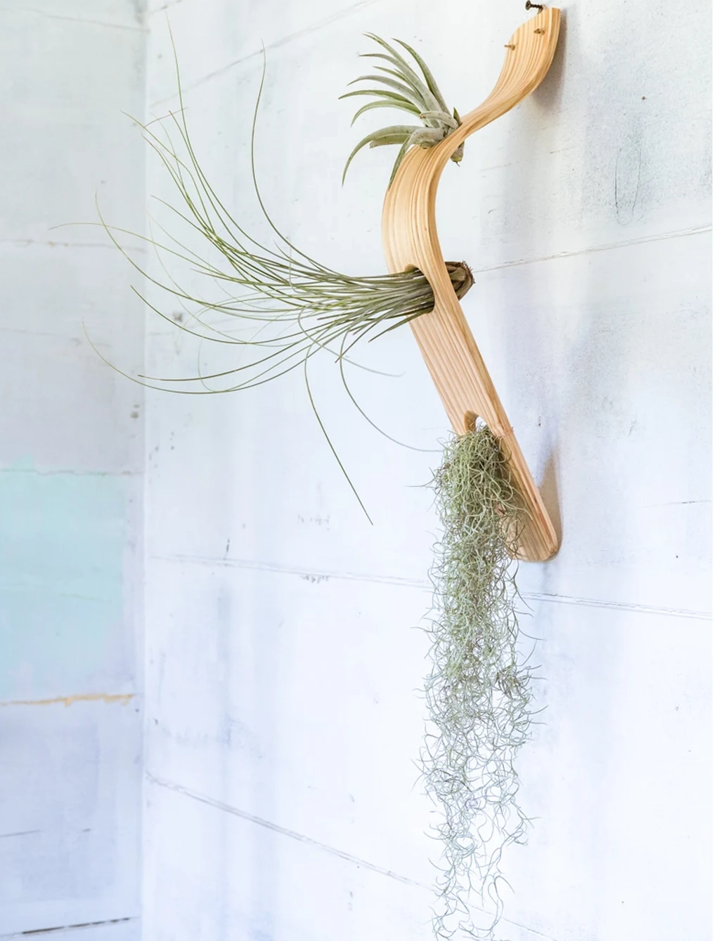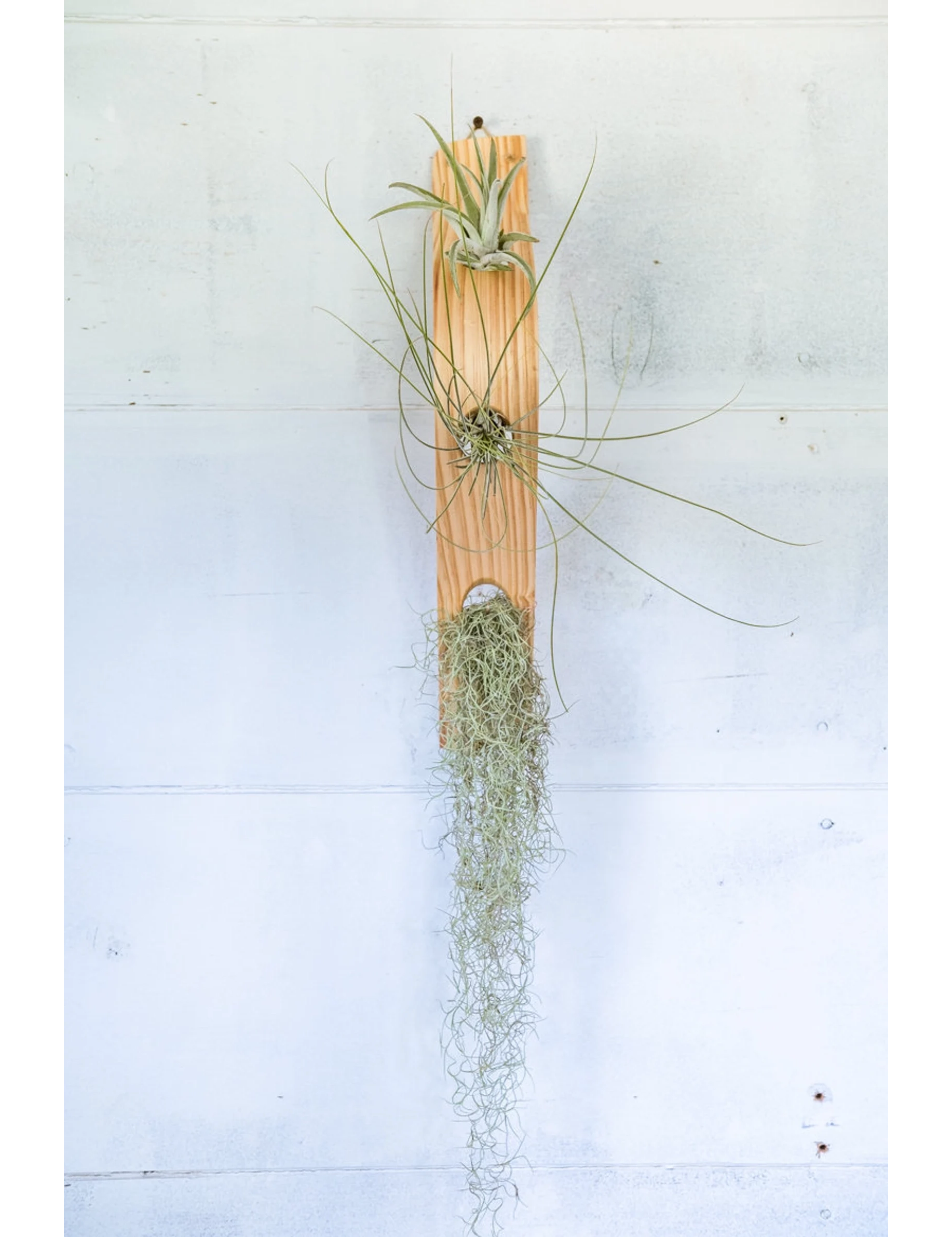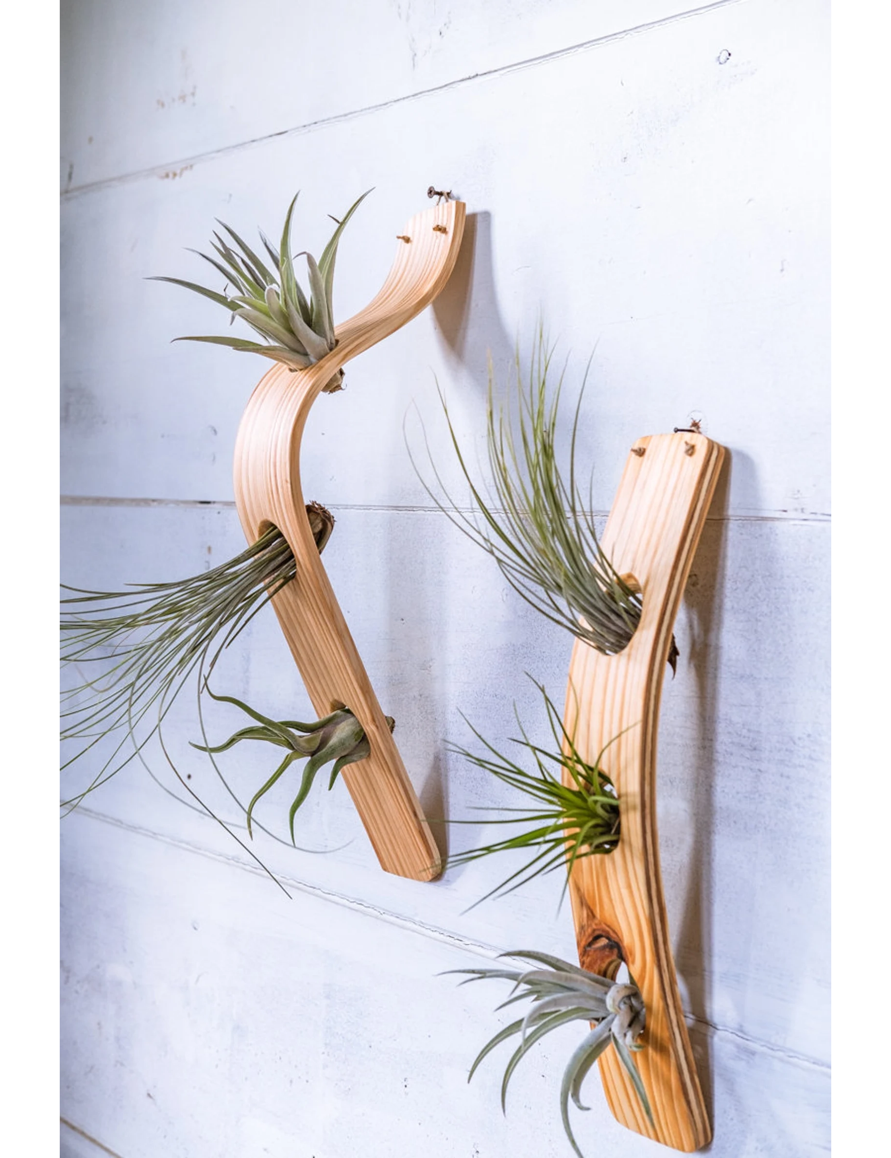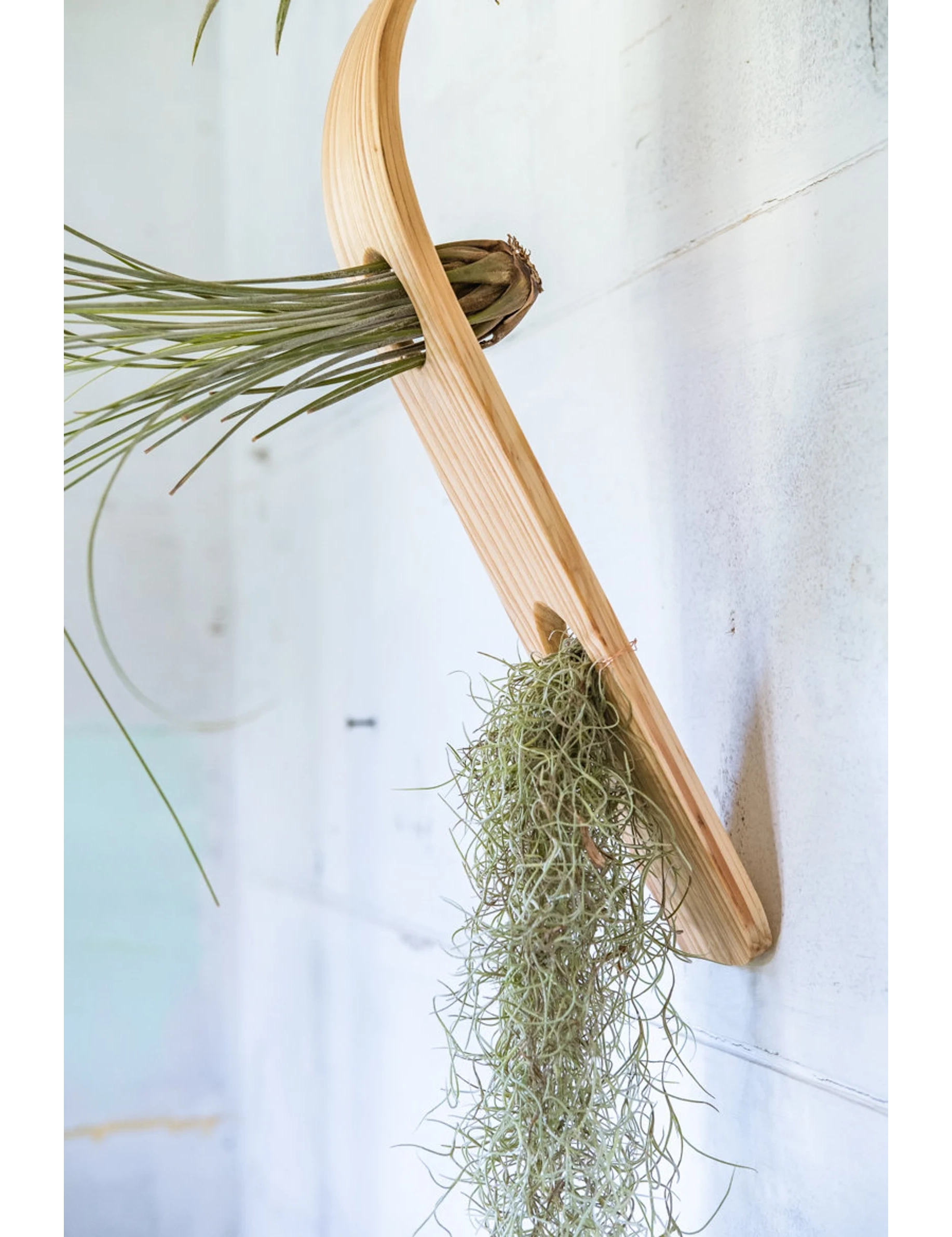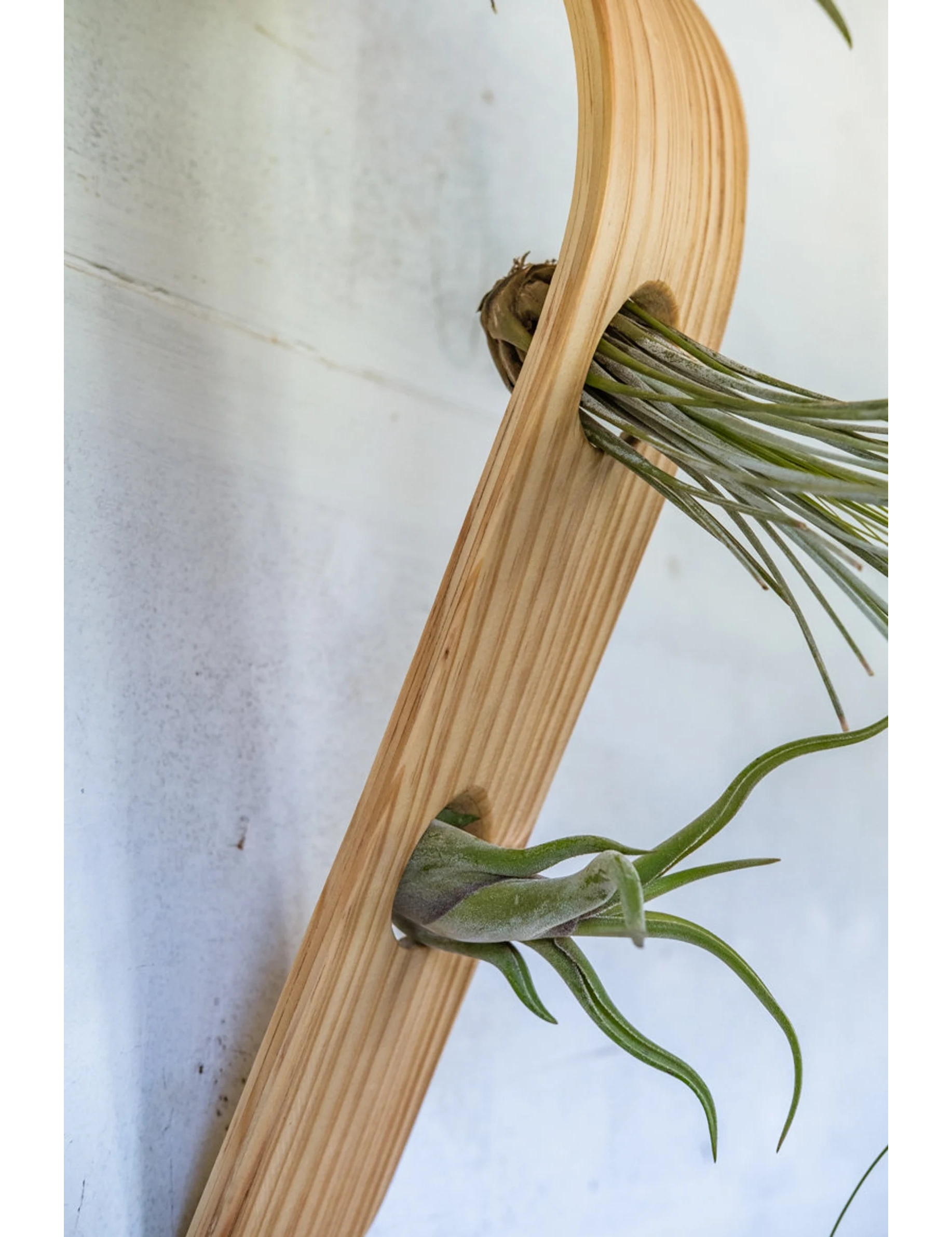 Handmade from solid pine wood and finished with mineral oil, each piece features carefully beveled holes that securely cradle air plants without the need for glue. Lightweight yet sturdy, this versatile piece can be hung using the included natural jute rope or displayed flat as a centerpiece by simply removing the rope.