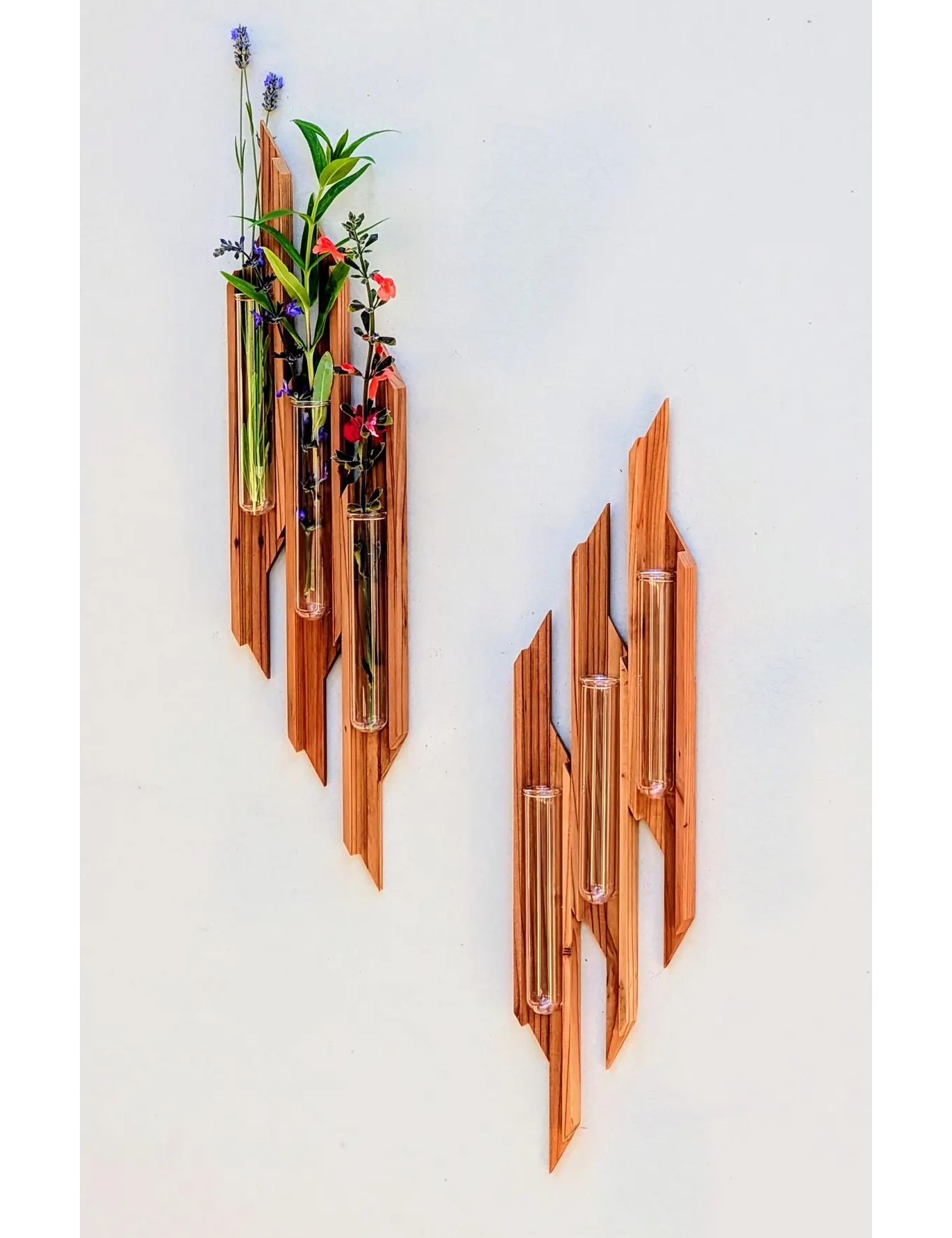 Add natural warmth and modern style to your home with this handcrafted Set of 2 Wall Planters by Krafted Kingdom. Designed using locally sourced Redwood and artisanal glass tubes, these minimalist wall vases are perfect for propagating cuttings or displaying fresh and dried botanicals. Each piece blends natural textures with clean lines to create a refined, contemporary accent.