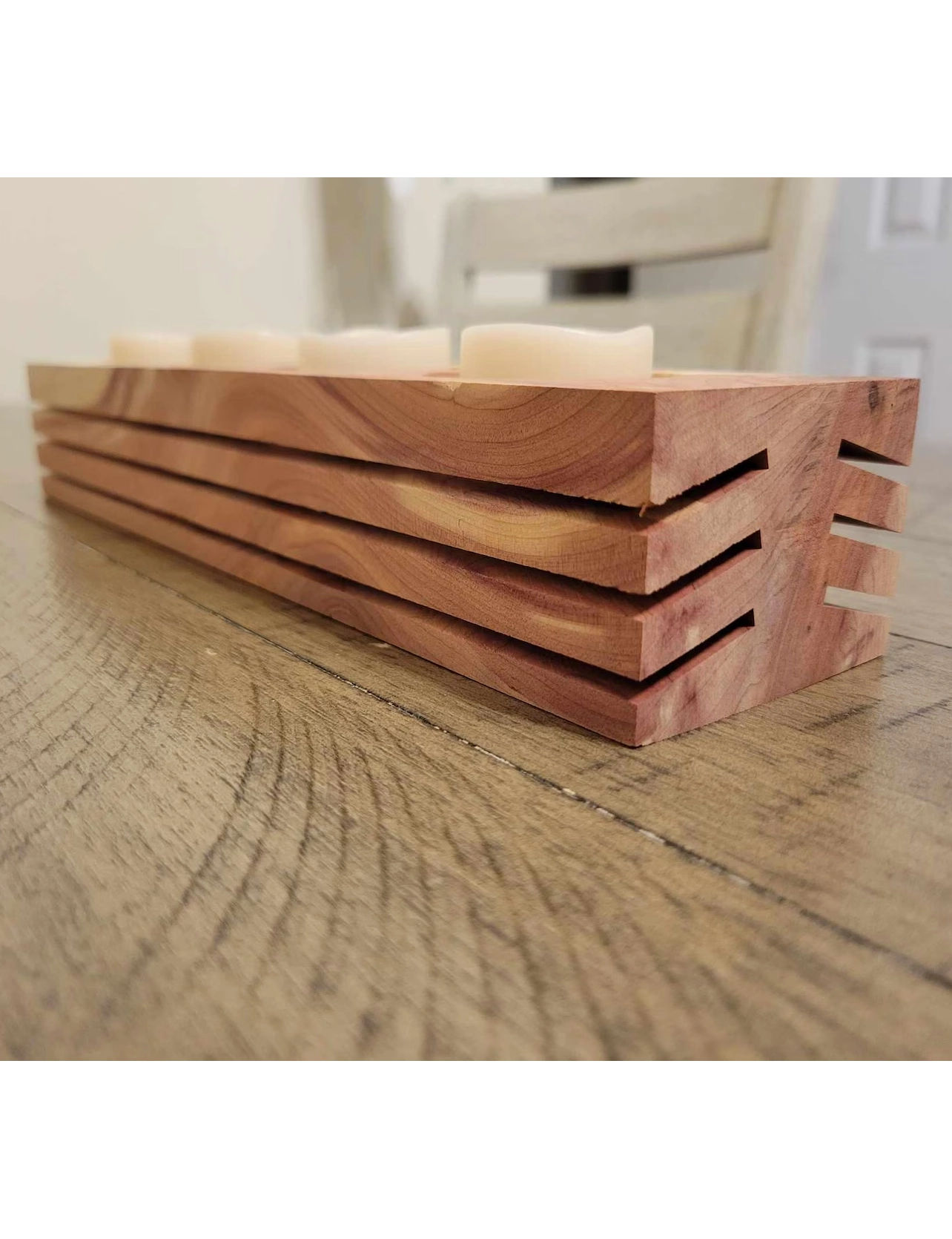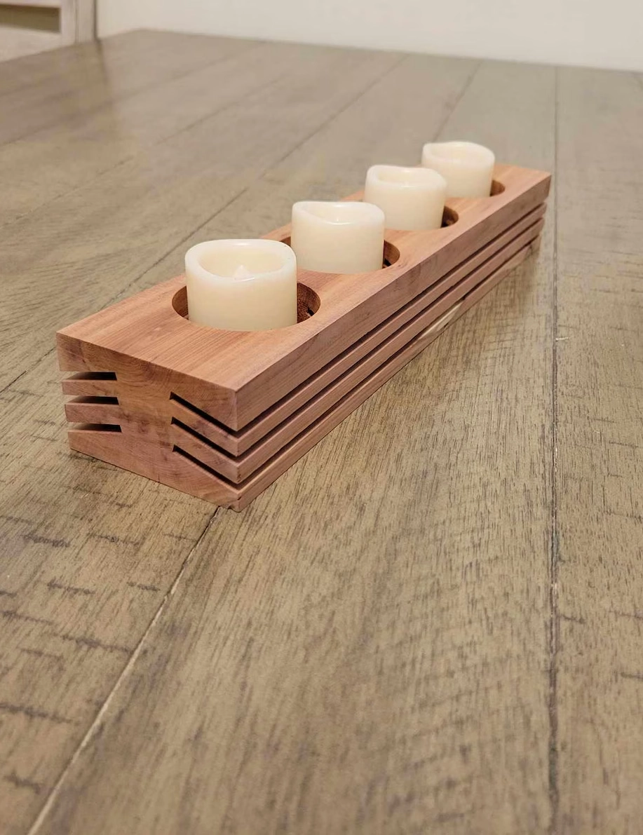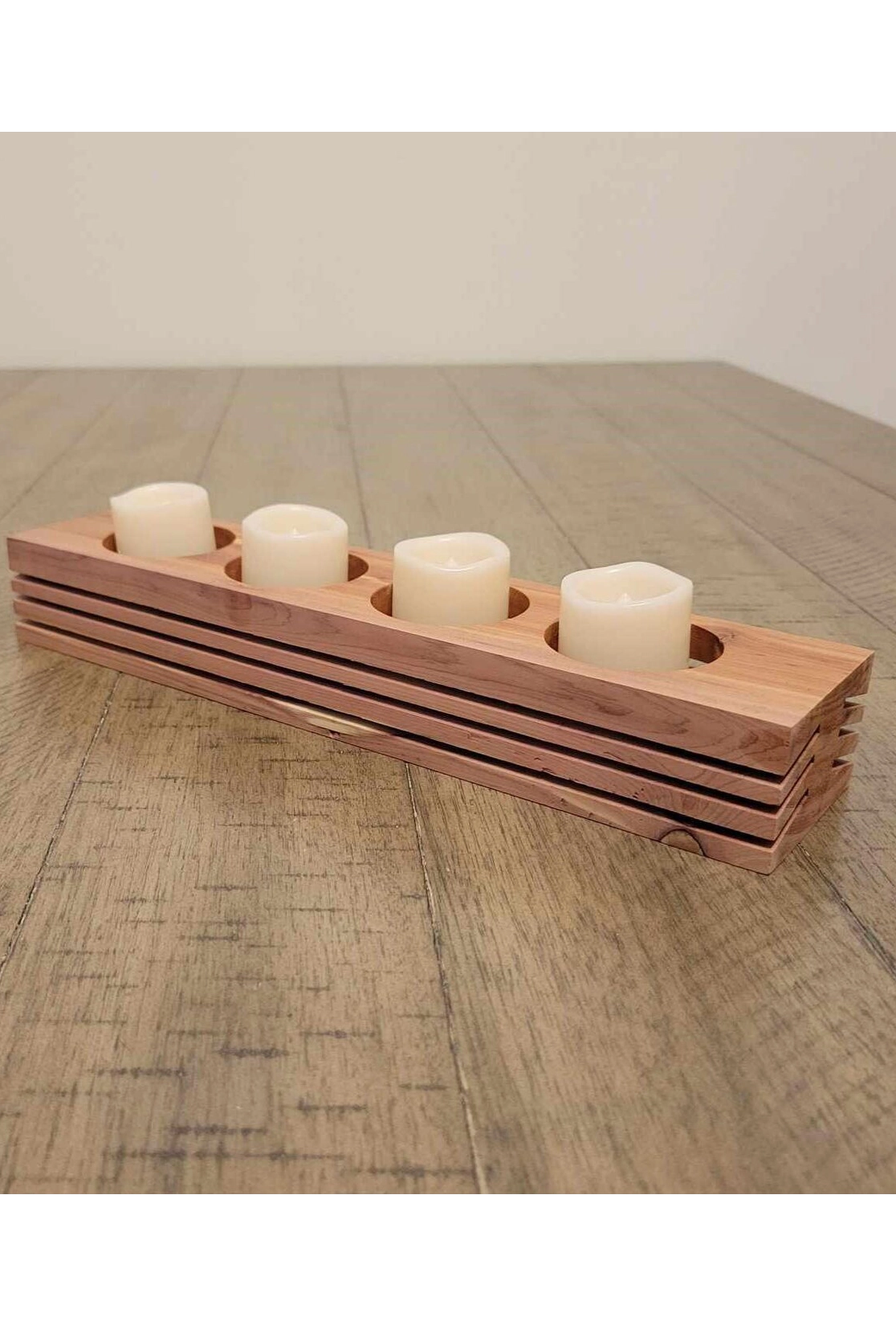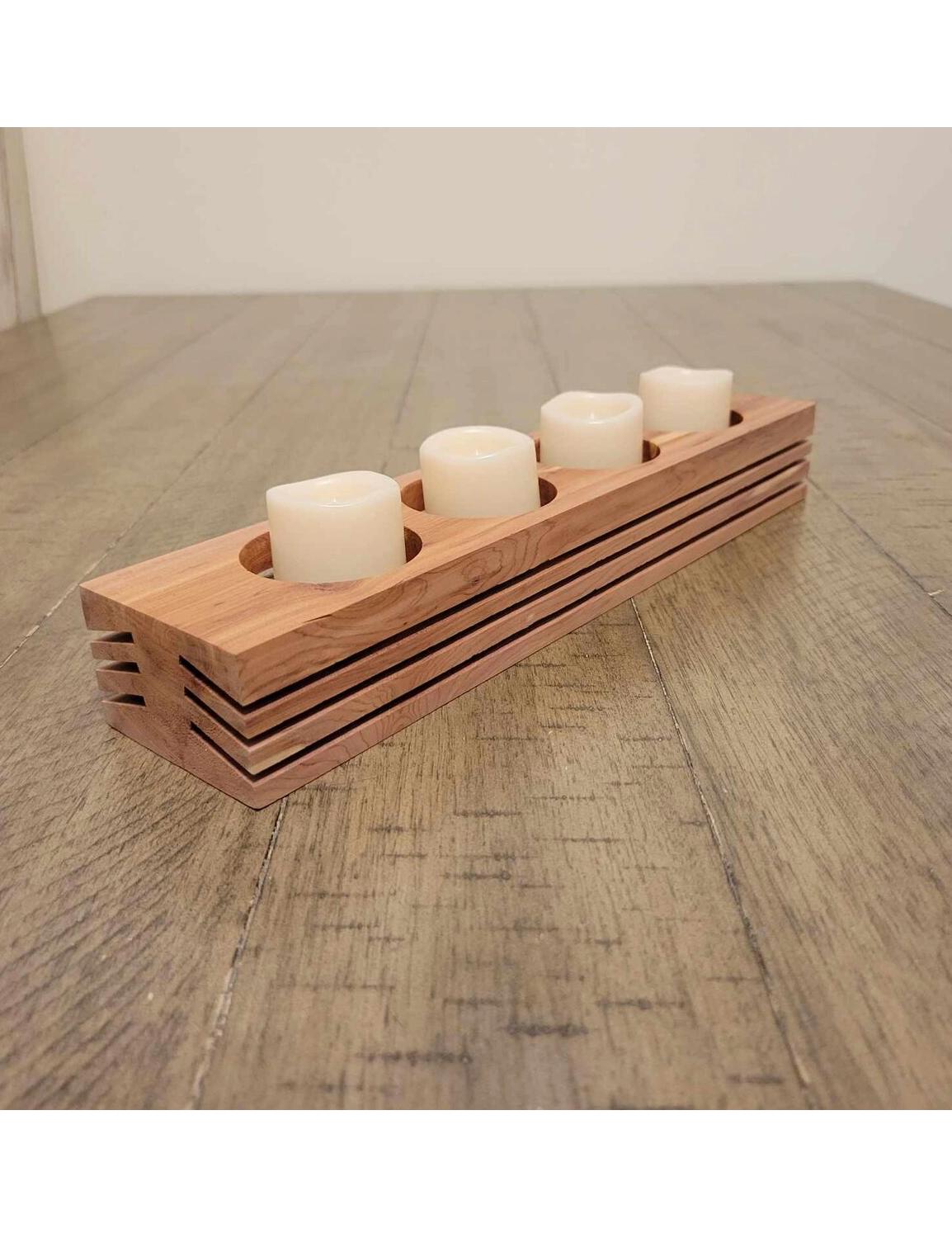Enhance your home with this handcrafted wooden votive candle holder made from aromatic red cedar. Designed to hold four flameless LED candles (Not included), this rustic centerpiece adds charm and warmth to any space. Its safe, flame-free glow makes it ideal for family homes, while its artisan craftsmanship makes it a unique and thoughtful gift for any occasion.